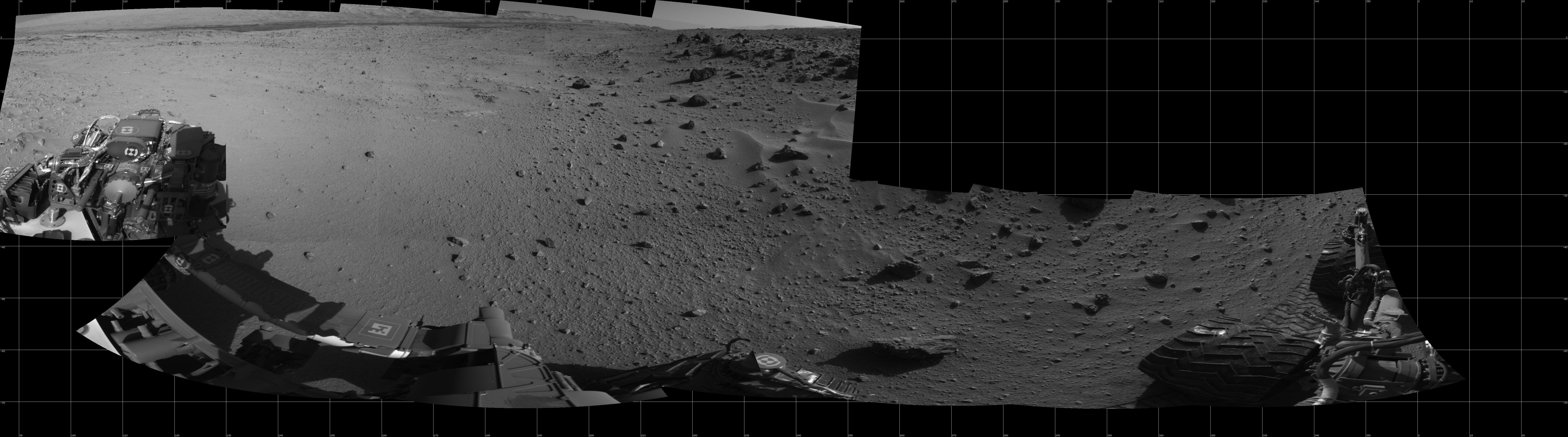 NASA's Mars rover Curiosity took 12 images in Gale Crater using its mast-mounted Left Navigation Camera (Navcam) to create this mosaic. The seam-corrected mosaic provides a 303-degree cylindrical projection panorama of the Martian surface centered at 238 degrees azimuth (measured clockwise from north). Curiosity took the images on February 27, 2014, Sol 555 of the Mars Science Laboratory mission at drive 634, site number 28. The local mean solar time for the image exposures was 3 PM. Each Navcam image has a 45 degree field of view. CREDIT: NASA/JPL-Caltech