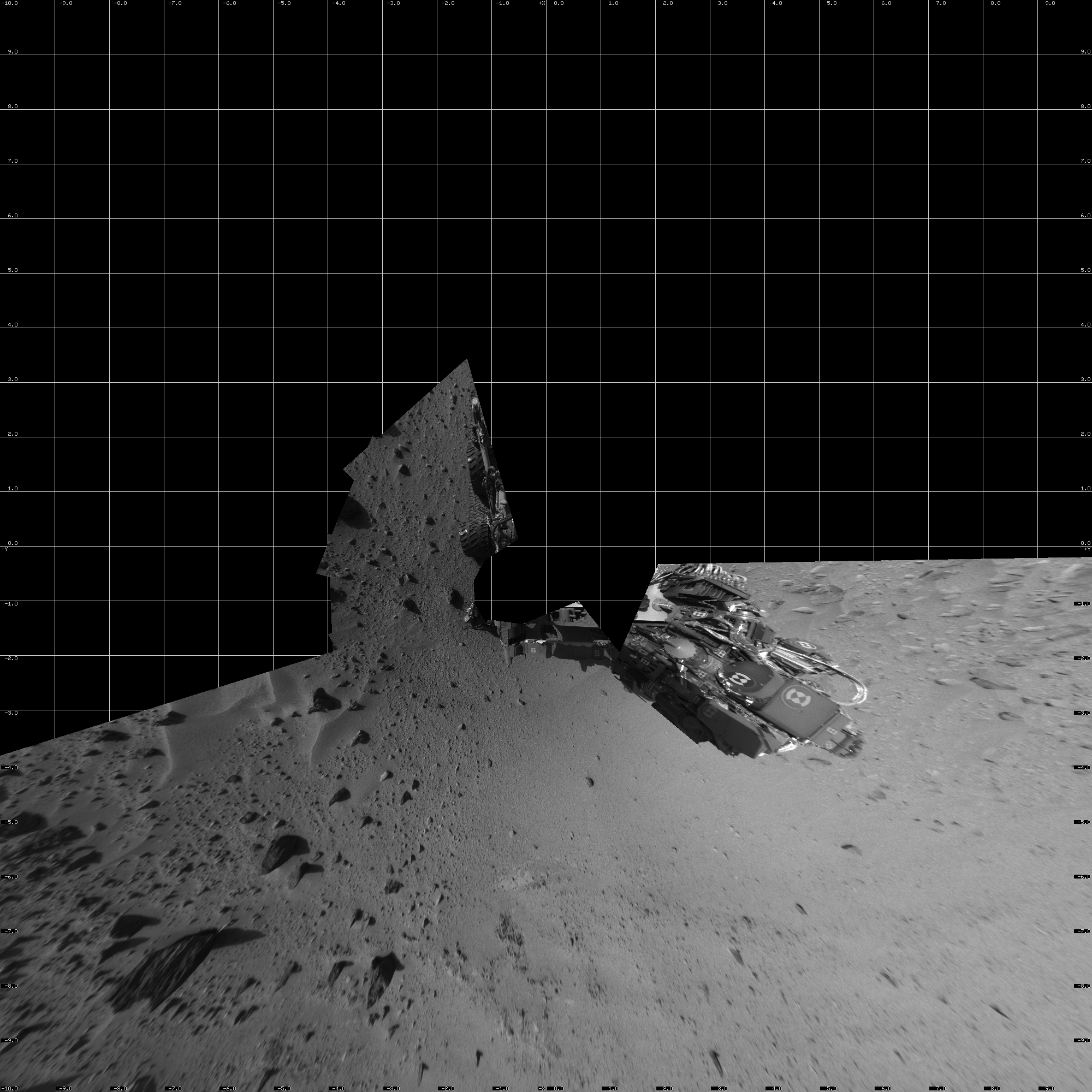 NASA's Mars rover Curiosity took 12 images in Gale Crater using its mast-mounted Left Navigation Camera (Navcam) to create this mosaic. The seam-corrected mosaic provides a vertical projection of the Martian surface near the rover, covering an area of 20 meters (north/south) by 20 meters (east/west). North is up in the image. This projection provides an overhead view, but introduces distortion for items not on the surface, such as large rocks and the rover itself. Curiosity took the images on February 27, 2014, Sol 555 of the Mars Science Laboratory mission at drive 634, site number 28. The local mean solar time for the image exposures was 3 PM. Each Navcam image has a 45-degree field of view. CREDIT: NASA/JPL-Caltech