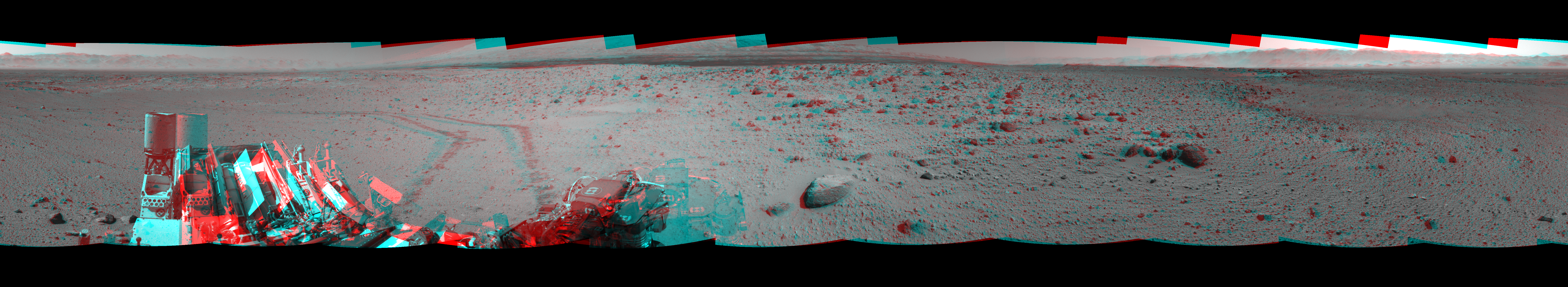 NASA's Mars rover Curiosity took 12 image pairs in Gale Crater using its mast-mounted Navigation Camera (Navcam) to create this mosaic. The seam-corrected mosaic provides a 360-degree cylindrical perspective projection panorama of the Martian surface suitable for stereo viewing, centered at 325 degrees azimuth (measured clockwise from north). This anaglyph must be viewed with red/blue glasses (red over left eye). Curiosity took the images on March 05, 2014, Sol 560 of the Mars Science Laboratory mission at drive 1122, site number 28. The local mean solar time for the image exposures was 2 PM. Each Navcam image has a 45-degree field of view. CREDIT: NASA/JPL-Caltech