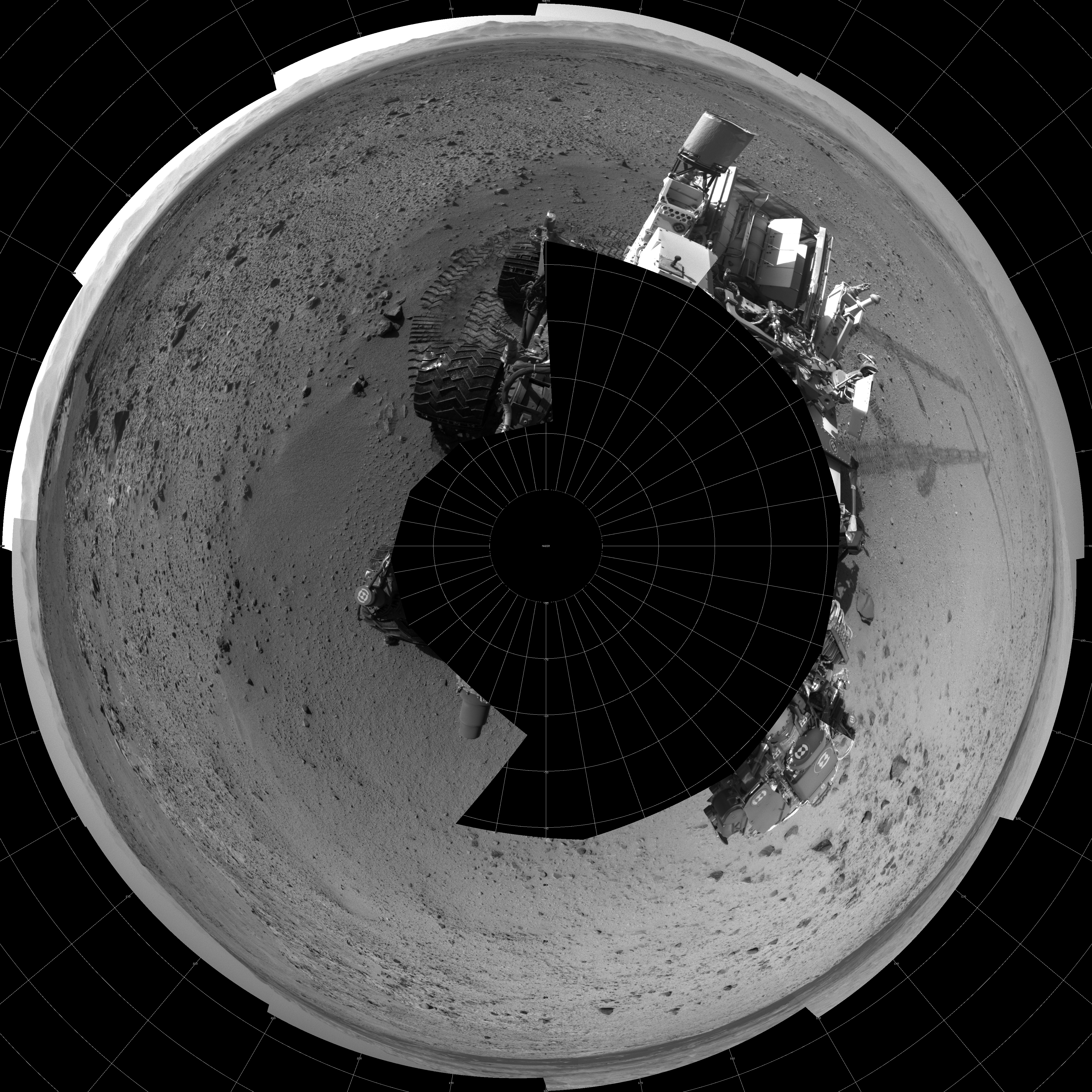 NASA's Mars rover Curiosity took 17 images in Gale Crater using its mast-mounted Left Navigation Camera (Navcam) to create this mosaic. The seam-corrected mosaic provides a polar stereographic projection panorama of the Martian surface with 0 degrees azimuth (measured clockwise from north) at the top of the image. Curiosity took the images on March 06, 2014, Sol 561 of the Mars Science Laboratory mission at drive 1350, site number 28. The local mean solar time for the image exposures was 2 PM. Each Navcam image has a 45-degree field of view. CREDIT: NASA/JPL-Caltech