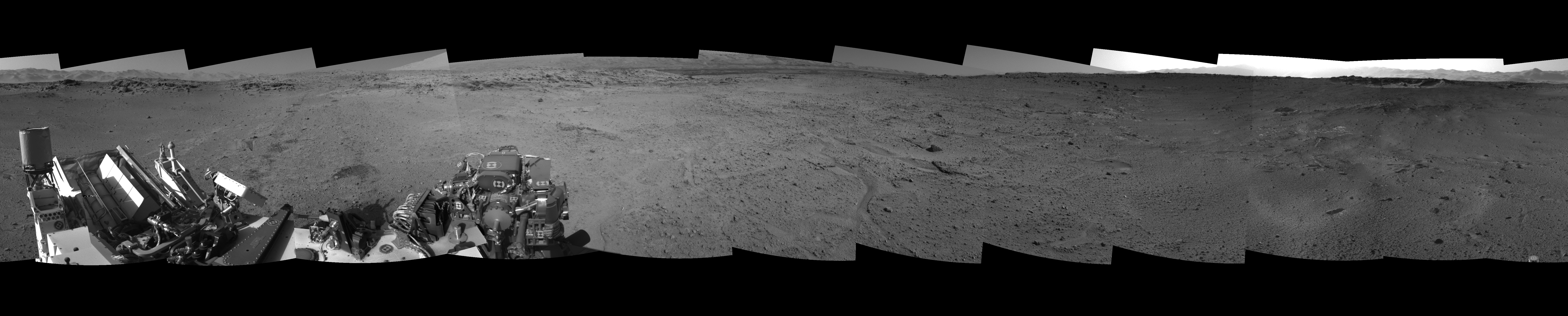 NASA's Mars rover Curiosity took 12 images in Gale Crater using its mast-mounted Left Navigation Camera (Navcam) to create this mosaic. The seam-corrected mosaic provides a 360-degree cylindrical-perspective projection panorama of the Martian surface suitable for stereo viewing, centered at 2 degrees azimuth (measured clockwise from north). This single-eye view must be combined with the partner right image to be viewed in stereo. Curiosity took the images on March 09, 2014, Sol 564 of the Mars Science Laboratory mission at drive 298, site number 29. The local mean solar time for the image exposures was from 2 PM to 4 PM. Each Navcam image has a 45-degree field of view. CREDIT: NASA/JPL-Caltech
