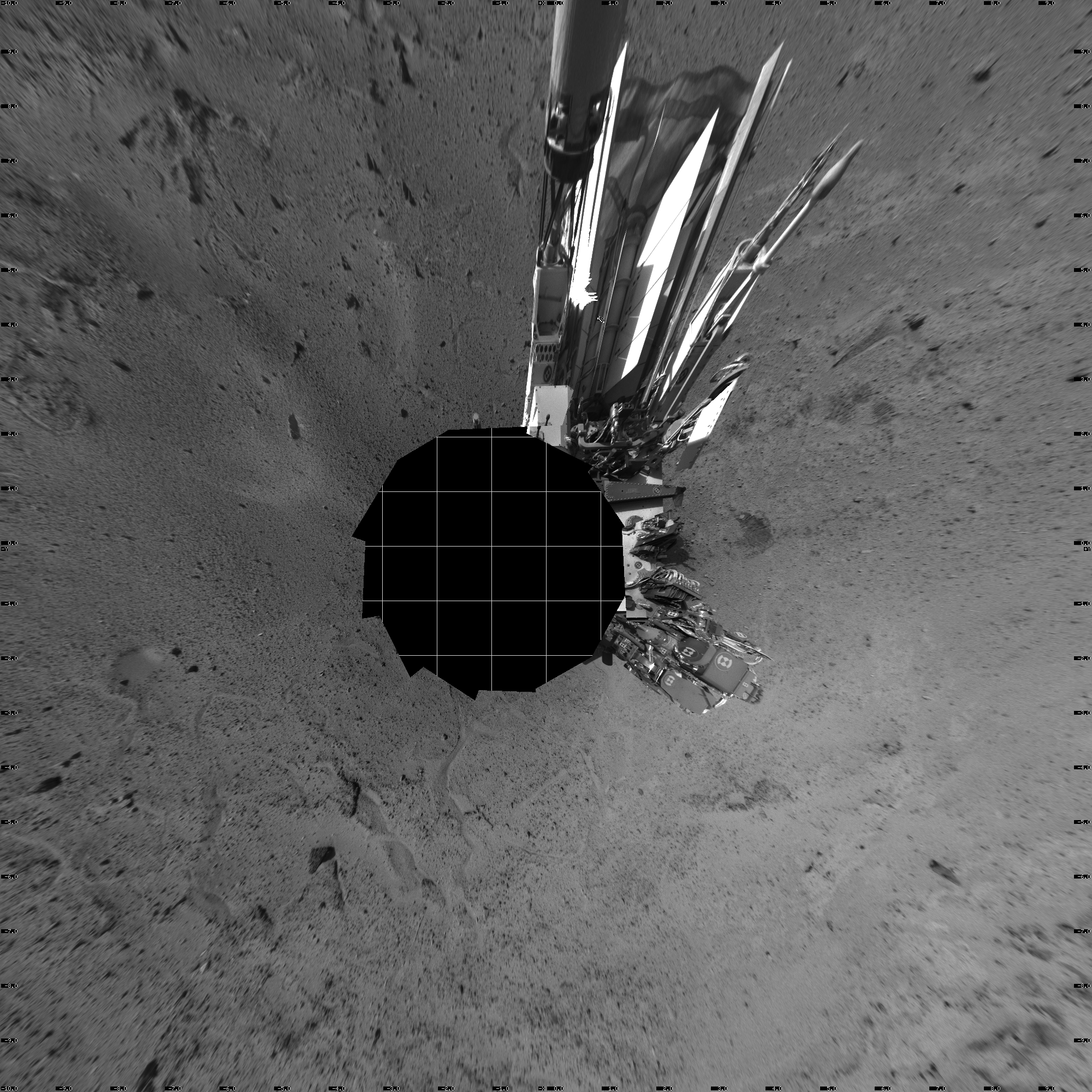 NASA's Mars rover Curiosity took 12 images in Gale Crater using its mast-mounted Left Navigation Camera (Navcam) to create this mosaic. The seam-corrected mosaic provides a vertical projection of the Martian surface near the rover, covering an area of 20 meters (north/south) by 20 meters (east/west). North is up in the image. This projection provides an overhead view, but introduces distortion for items not on the surface, such as large rocks and the rover itself. Curiosity took the images on March 09, 2014, Sol 564 of the Mars Science Laboratory mission at drive 298, site number 29. The local mean solar time for the image exposures was from 2 PM to 4 PM. Each Navcam image has a 45-degree field of view. CREDIT: NASA/JPL-Caltech