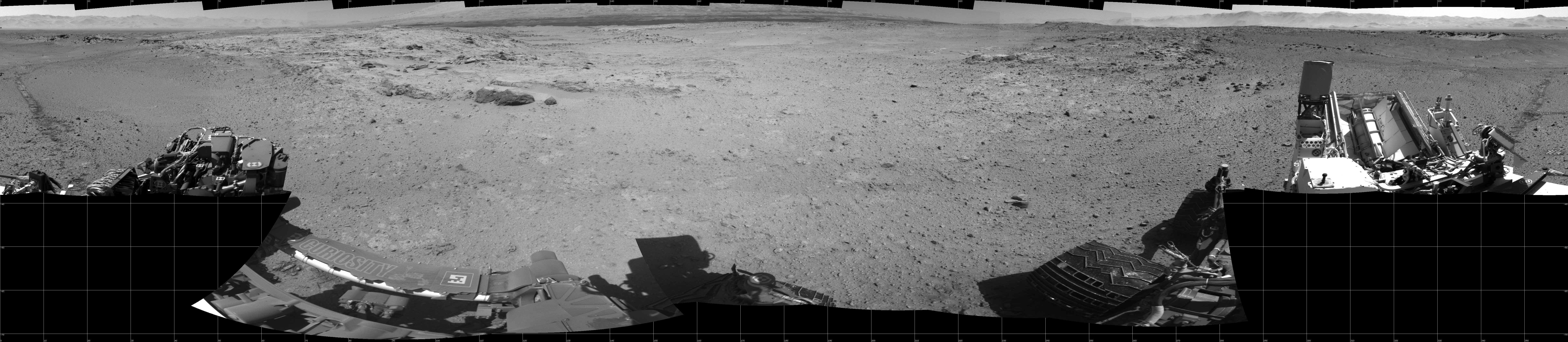 NASA's Mars rover Curiosity took 19 images in Gale Crater using its mast-mounted Left Navigation Camera (Navcam) to create this mosaic. The seam-corrected mosaic provides a 360-degree cylindrical projection panorama of the Martian surface centered at 180 degrees azimuth (measured clockwise from north). Curiosity took the images on March 10, 2014, Sol 565 of the Mars Science Laboratory mission at drive 536, site number 29. The local mean solar time for the image exposures was 1 PM. Each Navcam image has a 45 degree field of view. CREDIT: NASA/JPL-Caltech