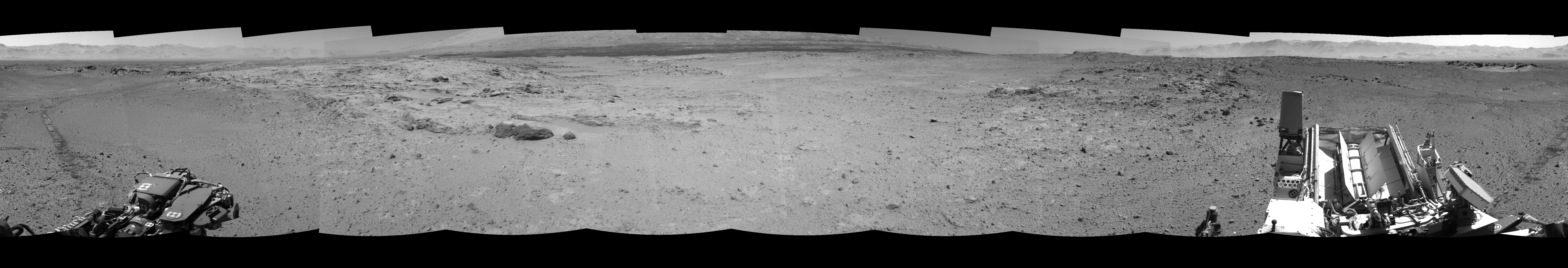 NASA's Mars rover Curiosity took 12 images in Gale Crater using its mast-mounted Right Navigation Camera (Navcam) to create this mosaic. The seam-corrected mosaic provides a 360-degree cylindrical-perspective projection panorama of the Martian surface suitable for stereo viewing, centered at 58 degrees azimuth (measured clockwise from north). This single-eye view must be combined with the partner left image to be viewed in stereo. Curiosity took the images on March 10, 2014, Sol 565 of the Mars Science Laboratory mission at drive 536, site number 29. The local mean solar time for the image exposures was 1 PM. Each Navcam image has a 45-degree field of view. CREDIT: NASA/JPL-Caltech