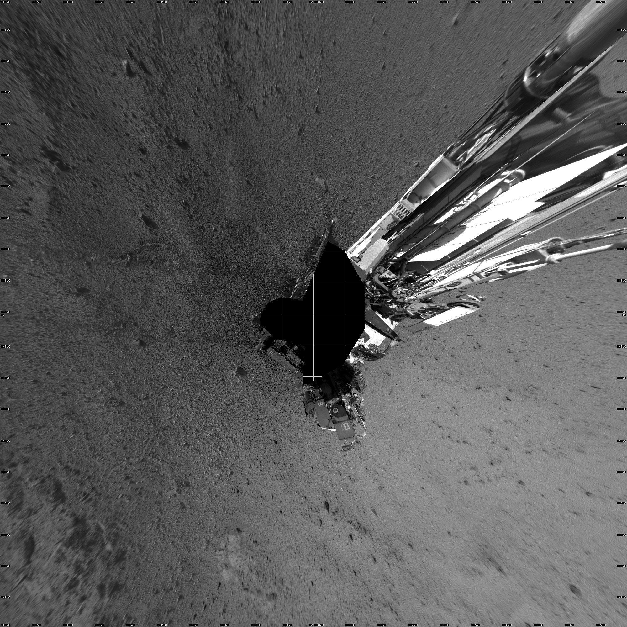 NASA's Mars rover Curiosity took 19 images in Gale Crater using its mast-mounted Left Navigation Camera (Navcam) to create this mosaic. The seam-corrected mosaic provides a vertical projection of the Martian surface near the rover, covering an area of 20 meters (north/south) by 20 meters (east/west). North is up in the image. This projection provides an overhead view, but introduces distortion for items not on the surface, such as large rocks and the rover itself. Curiosity took the images on March 14, 2014, Sol 569 of the Mars Science Laboratory mission at drive 0, site number 30. The local mean solar time for the image exposures was from 2 PM to 4 PM. Each Navcam image has a 45-degree field of view. CREDIT: NASA/JPL-Caltech