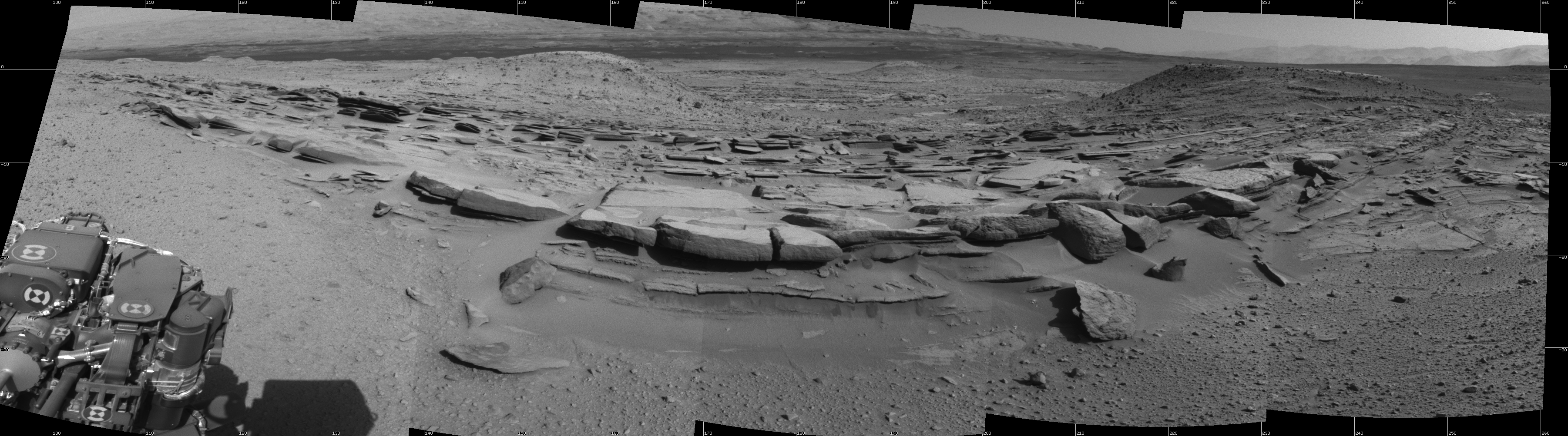 NASA's Mars rover Curiosity took 5 images in Gale Crater using its mast-mounted Left Navigation Camera (Navcam) to create this mosaic. The seam-corrected mosaic provides a 169-degree cylindrical projection panorama of the Martian surface centered at 179 degrees azimuth (measured clockwise from north). Curiosity took the images on March 19, 2014, Sol 574 of the Mars Science Laboratory mission at drive 740, site number 30. The local mean solar time for the image exposures was 3 PM. Each Navcam image has a 45 degree field of view. CREDIT: NASA/JPL-Caltech