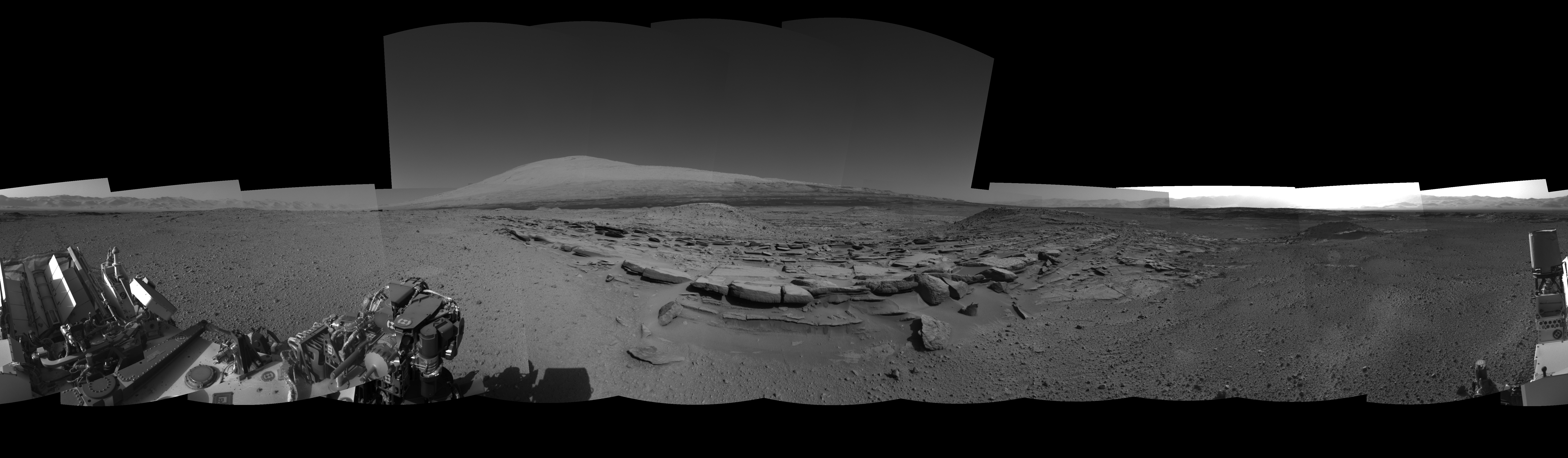 NASA's Mars rover Curiosity took 16 images in Gale Crater using its mast-mounted Right Navigation Camera (Navcam) to create this mosaic. The seam-corrected mosaic provides a 360-degree cylindrical-perspective projection panorama of the Martian surface suitable for stereo viewing, centered at 2 degrees azimuth (measured clockwise from north). This single-eye view must be combined with the partner left image to be viewed in stereo. Curiosity took the images on March 19, 2014, Sols 574-576 of the Mars Science Laboratory mission at drive 740, site number 30. The local mean solar time for the image exposures was from 1 PM to 3 PM. Each Navcam image has a 45-degree field of view. CREDIT: NASA/JPL-Caltech
