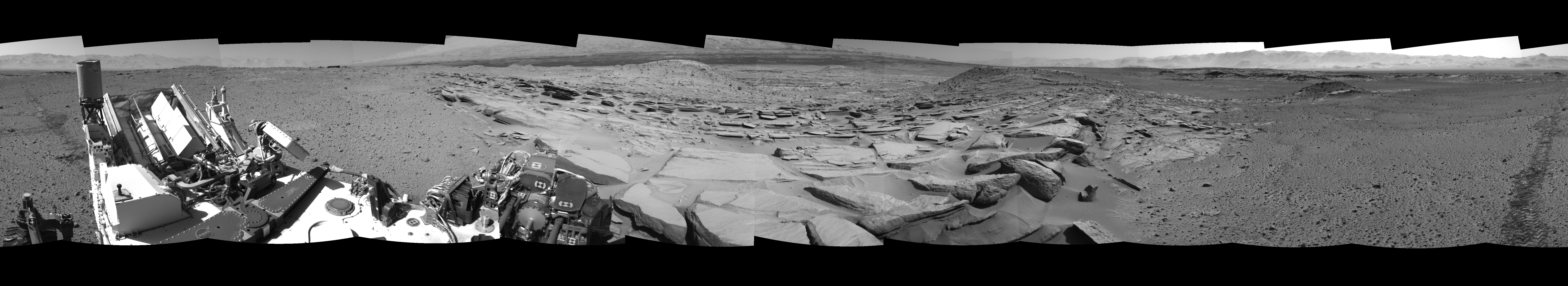 NASA's Mars rover Curiosity took 12 images in Gale Crater using its mast-mounted Left Navigation Camera (Navcam) to create this mosaic. The seam-corrected mosaic provides a 360-degree cylindrical-perspective projection panorama of the Martian surface suitable for stereo viewing, centered at 349 degrees azimuth (measured clockwise from north). This single-eye view must be combined with the partner right image to be viewed in stereo.  Curiosity took the images on March 26, 2014, Sol 581 of the Mars Science Laboratory mission at drive 786, site number 30. The local mean solar time for the image exposures was 2 PM. Each Navcam image has a 45-degree field of view. CREDIT: NASA/JPL-Caltech