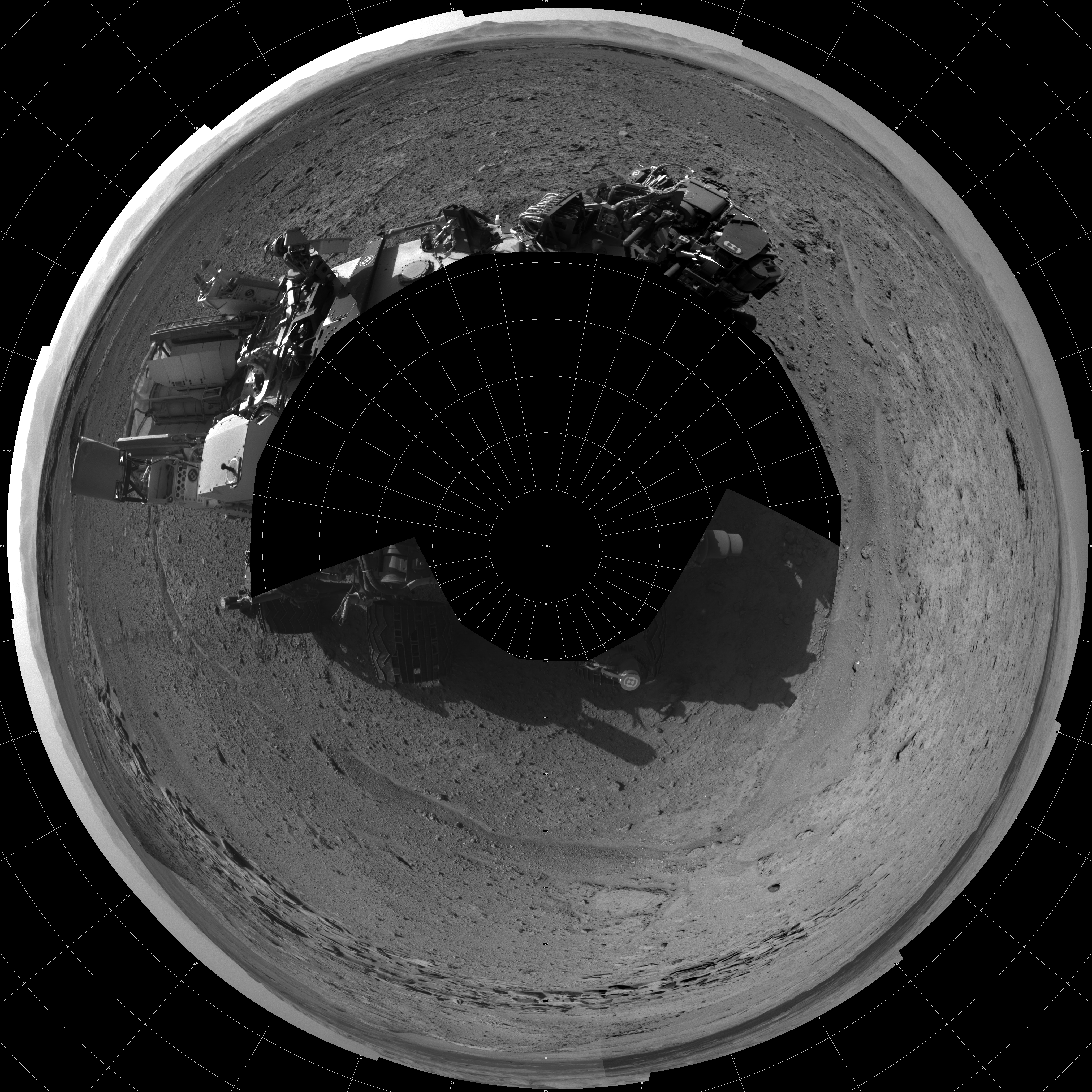 NASA's Mars rover Curiosity took 17 images in Gale Crater using its mast-mounted Left Navigation Camera (Navcam) to create this mosaic. The seam-corrected mosaic provides a polar stereographic projection panorama of the Martian surface with 0 degrees azimuth (measured clockwise from north) at the top of the image. Curiosity took the images on April 01, 2014, Sol 587 of the Mars Science Laboratory mission at drive 938, site number 30. The local mean solar time for the image exposures was from 2 PM to 3 PM. Each Navcam image has a 45-degree field of view. CREDIT: NASA/JPL-Caltech