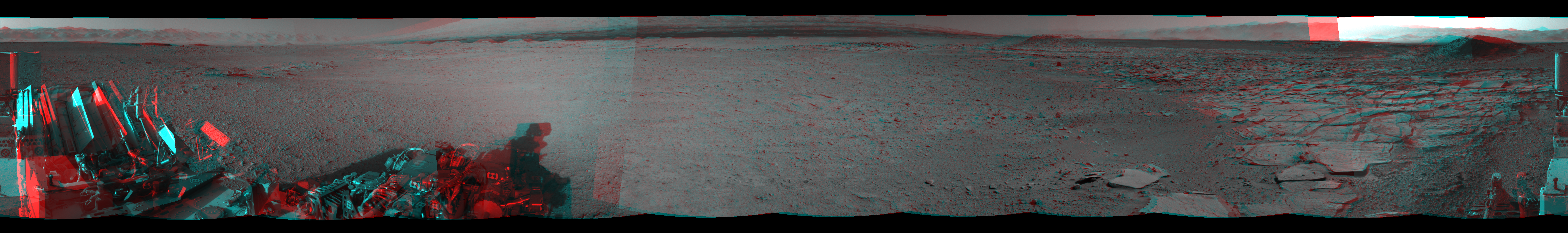 NASA's Mars rover Curiosity took 12 image pairs in Gale Crater using its mast-mounted Navigation Camera (Navcam) to create this mosaic. The seam-corrected mosaic provides a 360-degree cylindrical perspective projection panorama of the Martian surface suitable for stereo viewing, centered at 2 degrees azimuth (measured clockwise from north). This anaglyph must be viewed with red/blue glasses (red over left eye).  Curiosity took the images on April 07, 2014, Sol 593 of the Mars Science Laboratory mission at drive 216, site number 31. The local mean solar time for the image exposures was from 2 PM to 4 PM. Each Navcam image has a 45-degree field of view. CREDIT: NASA/JPL-Caltech