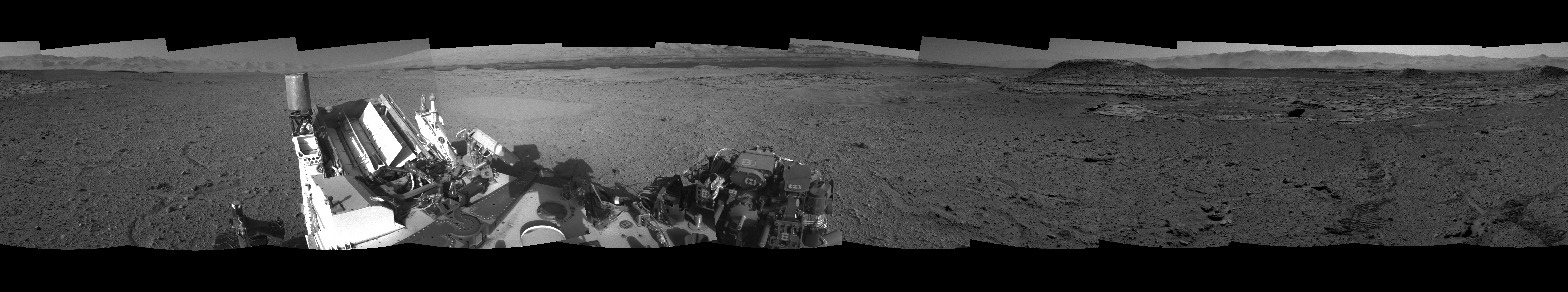 NASA's Mars rover Curiosity took 12 images in Gale Crater using its mast-mounted Left Navigation Camera (Navcam) to create this mosaic. The seam-corrected mosaic provides a 360-degree cylindrical-perspective projection panorama of the Martian surface suitable for stereo viewing, centered at 301 degrees azimuth (measured clockwise from north). This single-eye view must be combined with the partner right image to be viewed in stereo.  Curiosity took the images on April 10, 2014, Sol 595 of the Mars Science Laboratory mission at drive 538, site number 31. The local mean solar time for the image exposures was from 2 PM to 4 PM. Each Navcam image has a 45-degree field of view. CREDIT: NASA/JPL-Caltech