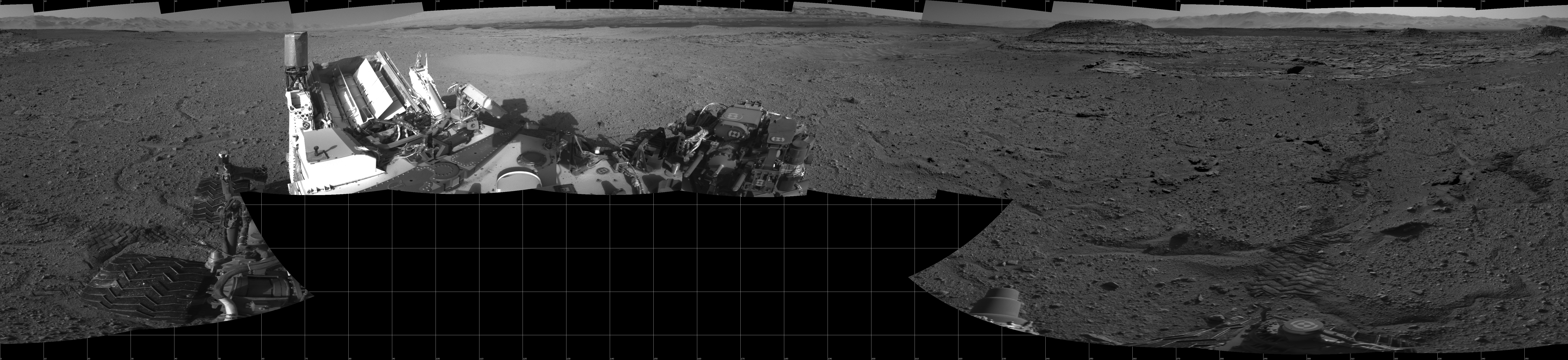 NASA's Mars rover Curiosity took 17 images in Gale Crater using its mast-mounted Left Navigation Camera (Navcam) to create this mosaic. The seam-corrected mosaic provides a 360-degree cylindrical projection panorama of the Martian surface centered at 180 degrees azimuth (measured clockwise from north). Curiosity took the images on April 10, 2014, Sol 595 of the Mars Science Laboratory mission at drive 538, site number 31. The local mean solar time for the image exposures was from 2 PM to 4 PM. Each Navcam image has a 45 degree field of view. CREDIT: NASA/JPL-Caltech