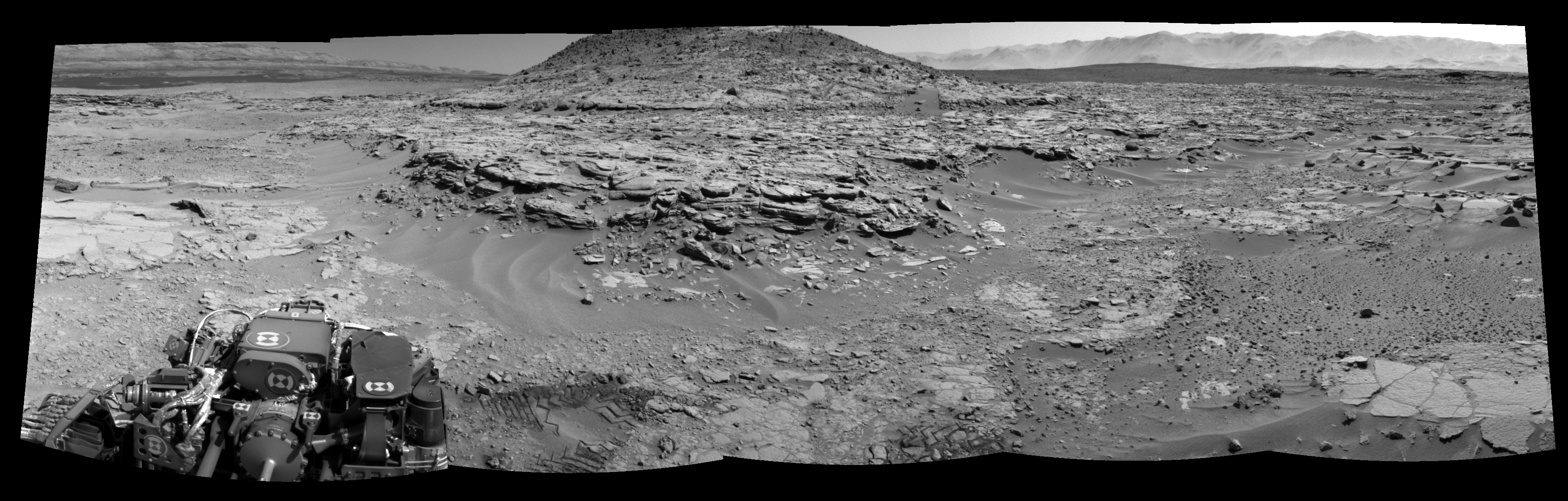 NASA's Mars rover Curiosity took 5 images in Gale Crater using its mast-mounted Left Navigation Camera (Navcam) to create this mosaic. The seam-corrected mosaic provides a 168-degree cylindrical-perspective projection panorama of the Martian surface suitable for stereo viewing, centered at 349 degrees azimuth (measured clockwise from north). This single-eye view must be combined with the partner right image to be viewed in stereo. Curiosity took the images on April 12, 2014, Sol 597 of the Mars Science Laboratory mission at drive 718, site number 31. The local mean solar time for the image exposures was 1 PM. Each Navcam image has a 45-degree field of view. CREDIT: NASA/JPL-Caltech