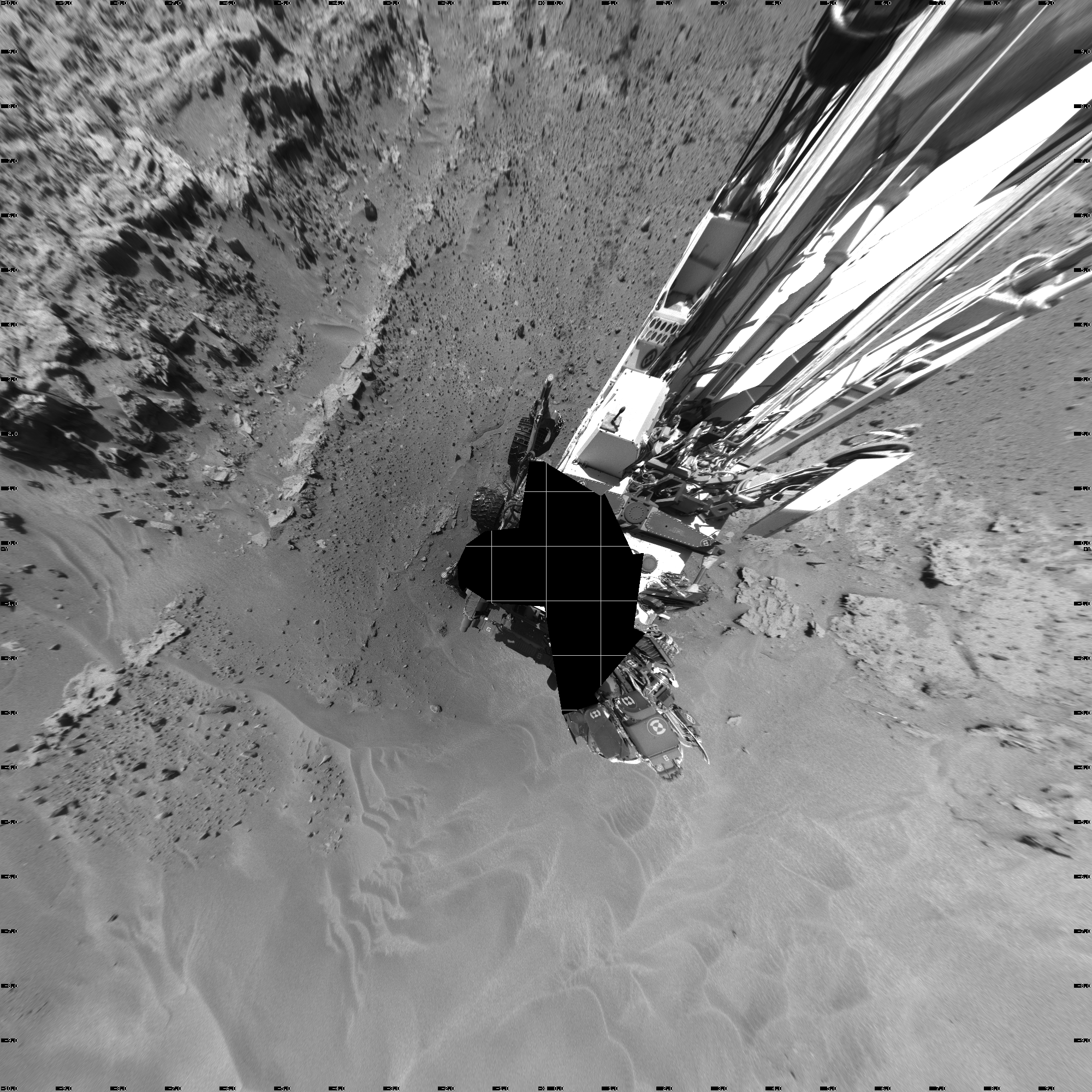 NASA's Mars rover Curiosity took 19 images in Gale Crater using its mast-mounted Left Navigation Camera (Navcam) to create this mosaic. The seam-corrected mosaic provides a vertical projection of the Martian surface near the rover, covering an area of 20 meters (north/south) by 20 meters (east/west). North is up in the image. This projection provides an overhead view, but introduces distortion for items not on the surface, such as large rocks and the rover itself. Curiosity took the images on April 18, 2014, Sol 603 of the Mars Science Laboratory mission at drive 1094, site number 31. The local mean solar time for the image exposures was 1 PM. Each Navcam image has a 45-degree field of view. CREDIT: NASA/JPL-Caltech