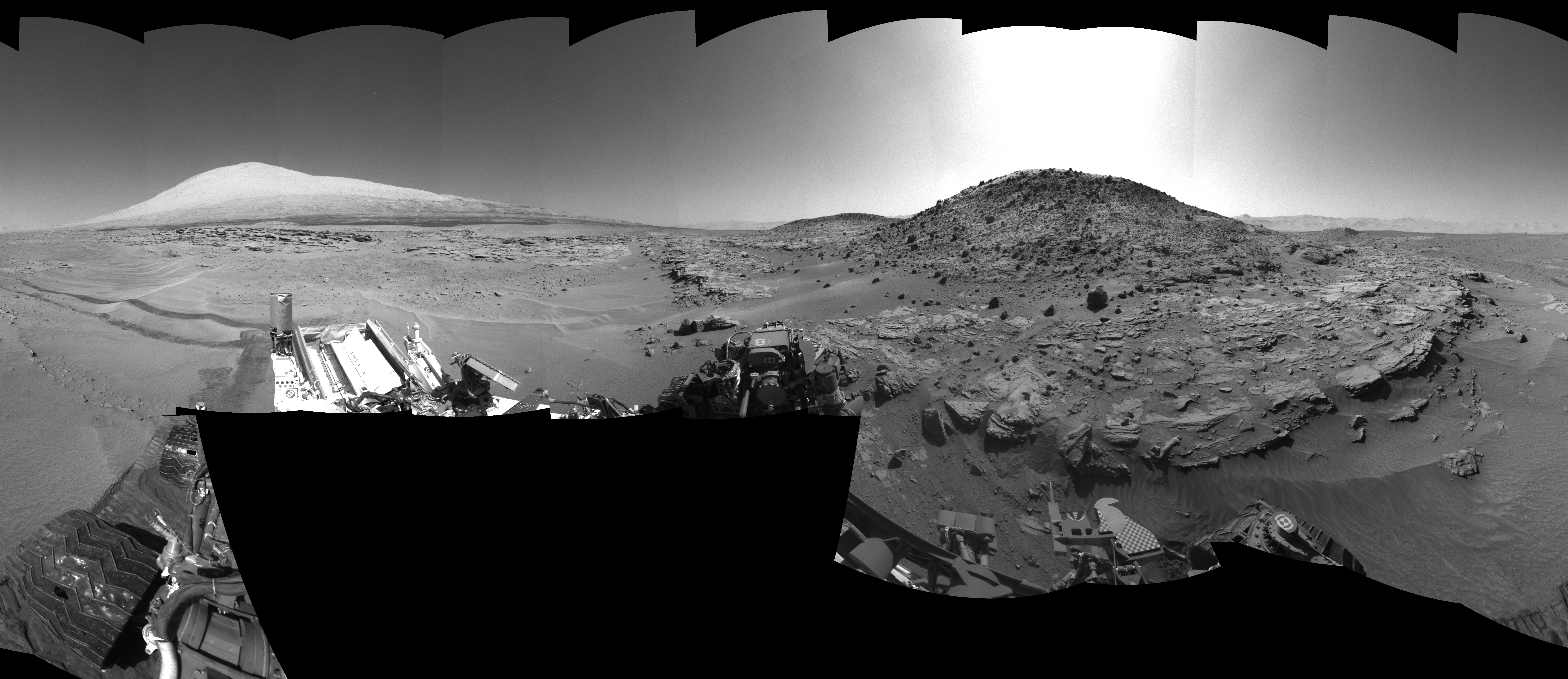 NASA's Mars rover Curiosity took 32 images in Gale Crater using its mast-mounted Left Navigation Camera (Navcam) to create this mosaic. The seam-corrected mosaic provides a 360-degree cylindrical-perspective projection panorama of the Martian surface suitable for stereo viewing, centered at 303 degrees azimuth (measured clockwise from north). This single-eye view must be combined with the partner right image to be viewed in stereo. Curiosity took the images on May 06, 2014, Sols 621-609 of the Mars Science Laboratory mission at drive 1330, site number 31. The local mean solar time for the image exposures was from 1 PM to 2 PM. Each Navcam image has a 45-degree field of view. CREDIT: NASA/JPL-Caltech
