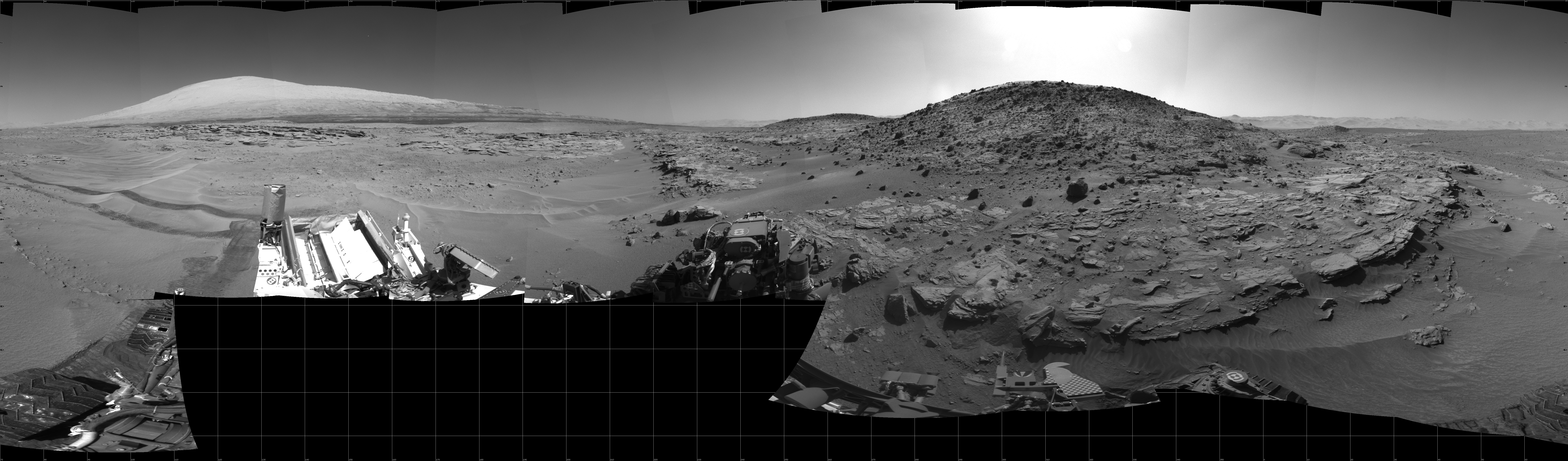 NASA's Mars rover Curiosity took 32 images in Gale Crater using its mast-mounted Left Navigation Camera (Navcam) to create this mosaic. The seam-corrected mosaic provides a 360-degree cylindrical projection panorama of the Martian surface centered at 250 degrees azimuth (measured clockwise from north). Curiosity took the images on May 06, 2014, Sols 621-609 of the Mars Science Laboratory mission at drive 1330, site number 31. The local mean solar time for the image exposures was from 1 PM to 2 PM. Each Navcam image has a 45 degree field of view. CREDIT: NASA/JPL-Caltech