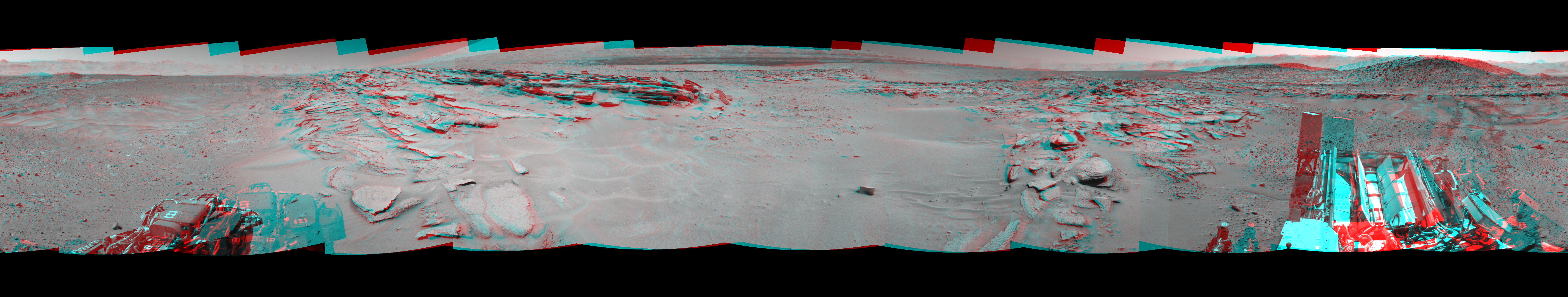 NASA's Mars rover Curiosity took 12 image pairs in Gale Crater using its mast-mounted Navigation Camera (Navcam) to create this mosaic. The seam-corrected mosaic provides a 360-degree cylindrical perspective projection panorama of the Martian surface suitable for stereo viewing, centered at 61 degrees azimuth (measured clockwise from north). This anaglyph must be viewed with red/blue glasses (red over left eye). Curiosity took the images on May 15, 2014, Sol 630 of the Mars Science Laboratory mission at drive 1472, site number 31. The local mean solar time for the image exposures was 1 PM. Each Navcam image has a 45-degree field of view. CREDIT: NASA/JPL-Caltech