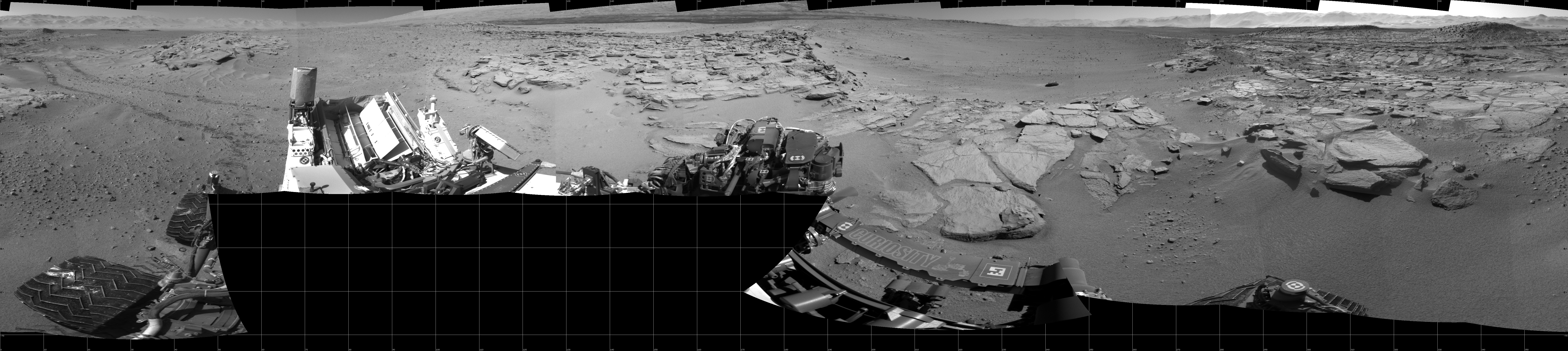 NASA's Mars rover Curiosity took 18 images in Gale Crater using its mast-mounted Left Navigation Camera (Navcam) to create this mosaic. The seam-corrected mosaic provides a 360-degree cylindrical projection panorama of the Martian surface centered at 180 degrees azimuth (measured clockwise from north). Curiosity took the images on May 17, 2014, Sol 631 of the Mars Science Laboratory mission at drive 0, site number 32. The local mean solar time for the image exposures was from 1 PM to 2 PM. Each Navcam image has a 45 degree field of view. CREDIT: NASA/JPL-Caltech