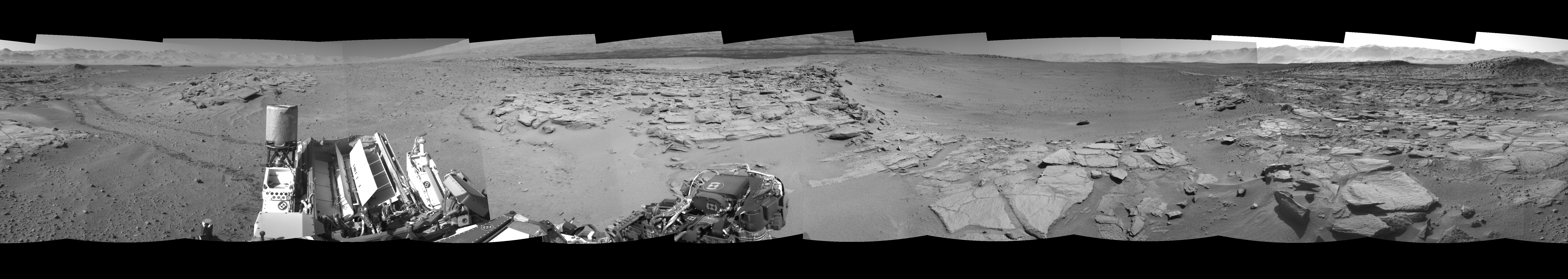 NASA's Mars rover Curiosity took 12 images in Gale Crater using its mast-mounted Right Navigation Camera (Navcam) to create this mosaic. The seam-corrected mosaic provides a 0-degree cylindrical-perspective projection panorama of the Martian surface suitable for stereo viewing, centered at 110 degrees azimuth (measured clockwise from north). This single-eye view must be combined with the partner left image to be viewed in stereo. Curiosity took the images on May 17, 2014, Sol 631 of the Mars Science Laboratory mission at drive 0, site number 32. The local mean solar time for the image exposures was 1 PM. Each Navcam image has a 45-degree field of view. CREDIT: NASA/JPL-Caltech