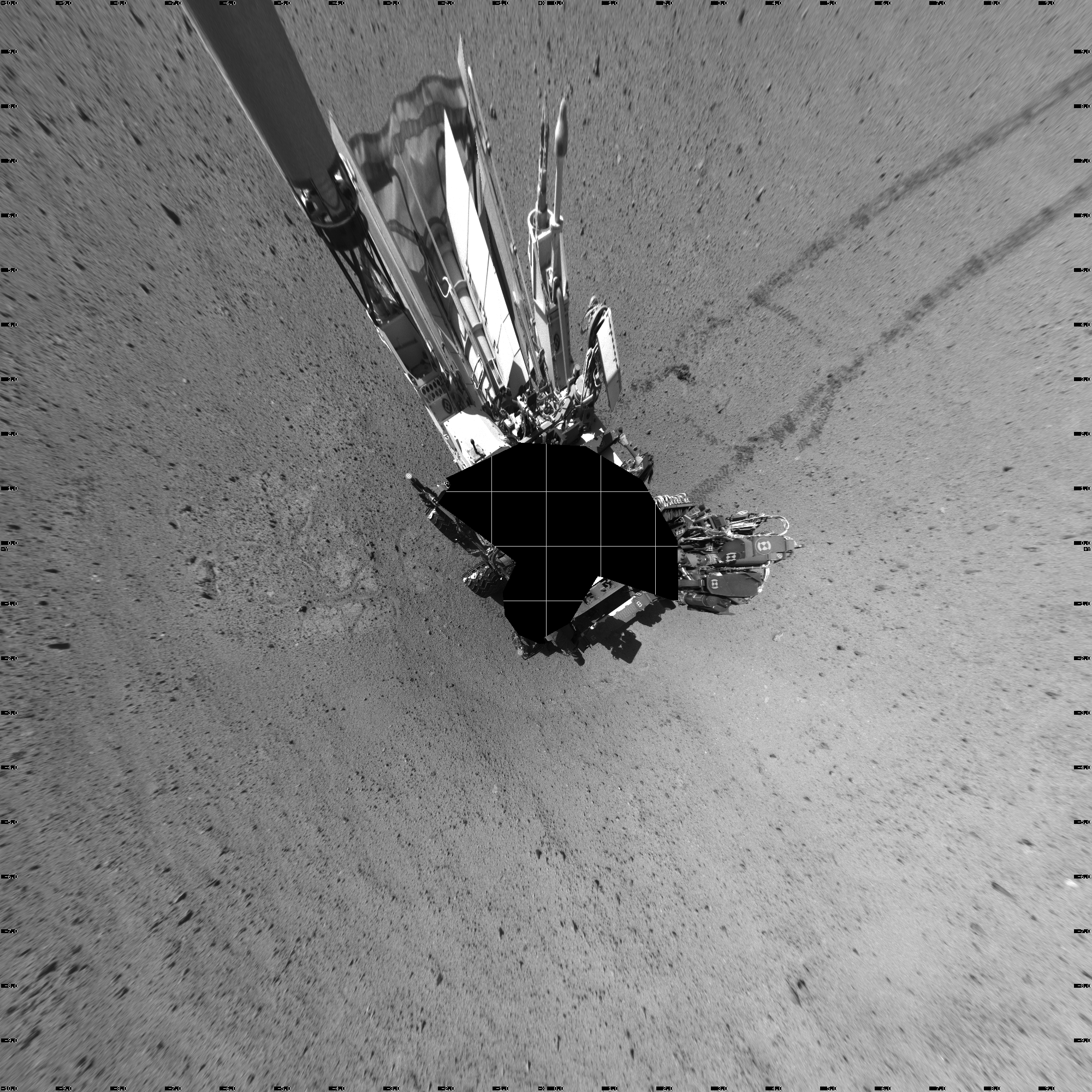 NASA's Mars rover Curiosity took 19 images in Gale Crater using its mast-mounted Left Navigation Camera (Navcam) to create this mosaic. The seam-corrected mosaic provides a vertical projection of the Martian surface near the rover, covering an area of 20 meters (north/south) by 20 meters (east/west). North is up in the image. This projection provides an overhead view, but introduces distortion for items not on the surface, such as large rocks and the rover itself. Curiosity took the images on May 20, 2014, Sol 634 of the Mars Science Laboratory mission at drive 478, site number 32. The local mean solar time for the image exposures was 2 PM. Each Navcam image has a 45-degree field of view. CREDIT: NASA/JPL-Caltech
