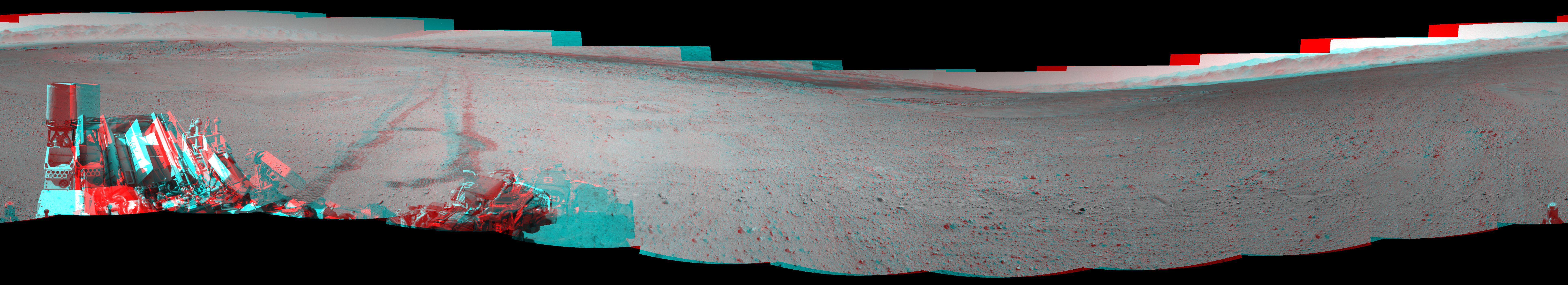 NASA's Mars rover Curiosity took 12 image pairs in Gale Crater using its mast-mounted Navigation Camera (Navcam) to create this mosaic. The seam-corrected mosaic provides a 360-degree cylindrical perspective projection panorama of the Martian surface suitable for stereo viewing, centered at 349 degrees azimuth (measured clockwise from north). This anaglyph must be viewed with red/blue glasses (red over left eye). Curiosity took the images on May 21, 2014, Sol 635 of the Mars Science Laboratory mission at drive 794, site number 32. The local mean solar time for the image exposures was 2 PM. Each Navcam image has a 45-degree field of view. CREDIT: NASA/JPL-Caltech