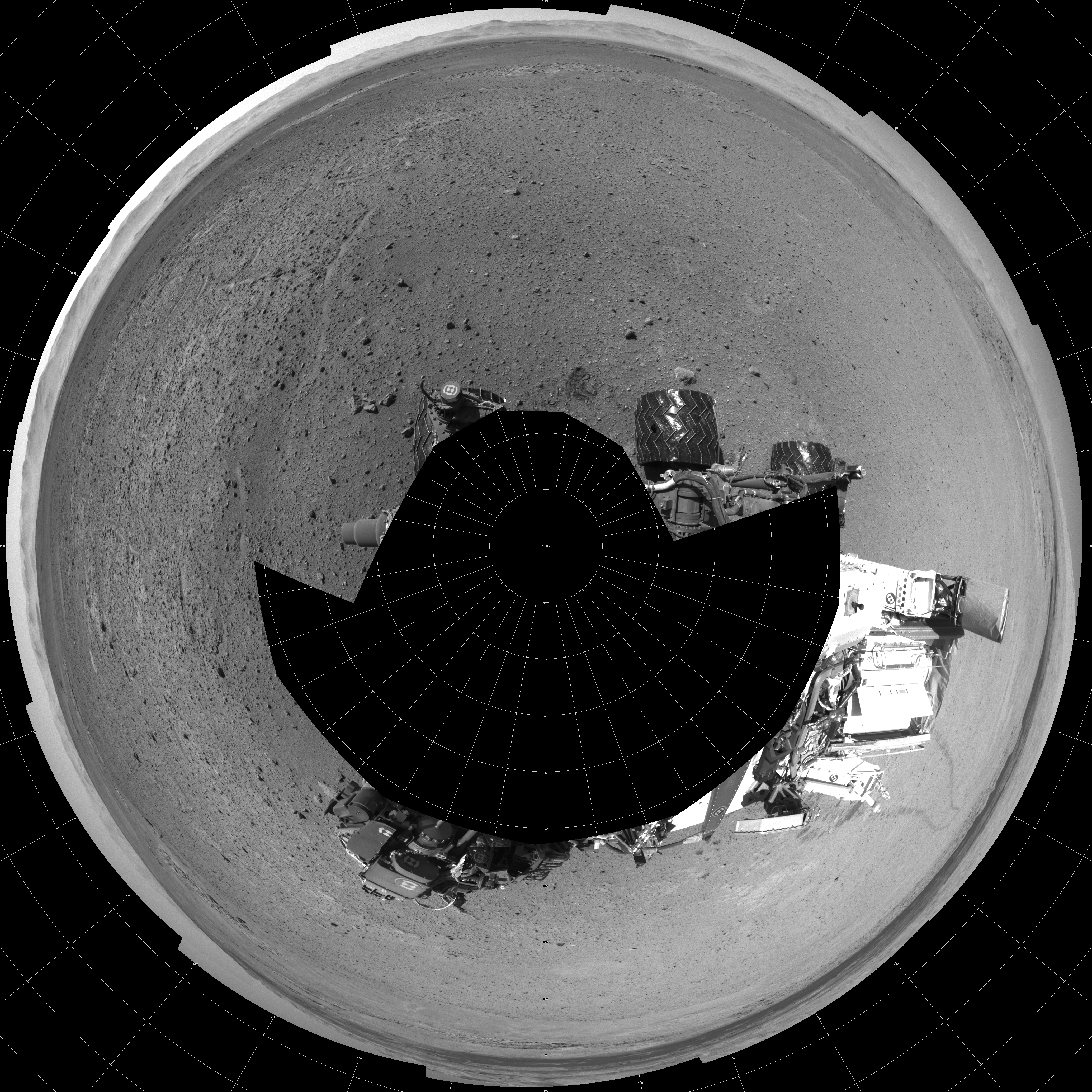NASA's Mars rover Curiosity took 17 images in Gale Crater using its mast-mounted Left Navigation Camera (Navcam) to create this mosaic. The seam-corrected mosaic provides a polar stereographic projection panorama of the Martian surface with 0 degrees azimuth (measured clockwise from north) at the top of the image. Curiosity took the images on May 22, 2014, Sol 636 of the Mars Science Laboratory mission at drive 1020, site number 32. The local mean solar time for the image exposures was 2 PM. Each Navcam image has a 45-degree field of view. CREDIT: NASA/JPL-Caltech
