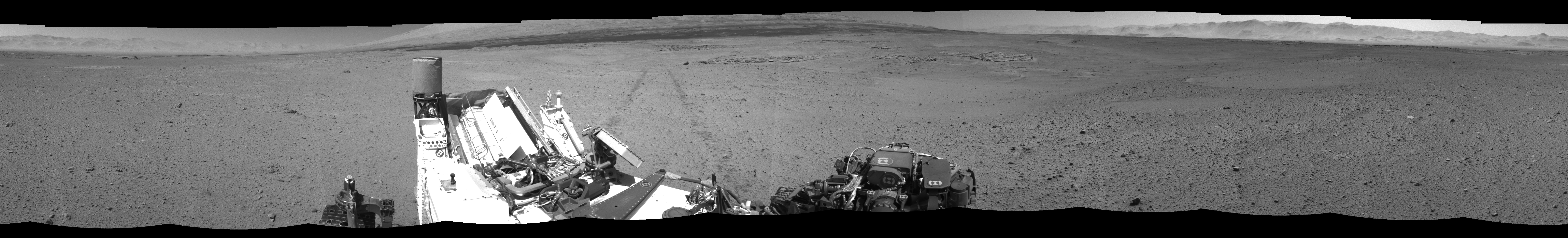 NASA's Mars rover Curiosity took 12 images in Gale Crater using its mast-mounted Left Navigation Camera (Navcam) to create this mosaic. The seam-corrected mosaic provides a 360-degree cylindrical-perspective projection panorama of the Martian surface suitable for stereo viewing, centered at 271 degrees azimuth (measured clockwise from north). This single-eye view must be combined with the partner right image to be viewed in stereo. Curiosity took the images on May 27, 2014, Sol 641 of the Mars Science Laboratory mission at drive 308, site number 33. The local mean solar time for the image exposures was from 1 PM to 2 PM. Each Navcam image has a 45-degree field of view. CREDIT: NASA/JPL-Caltech
