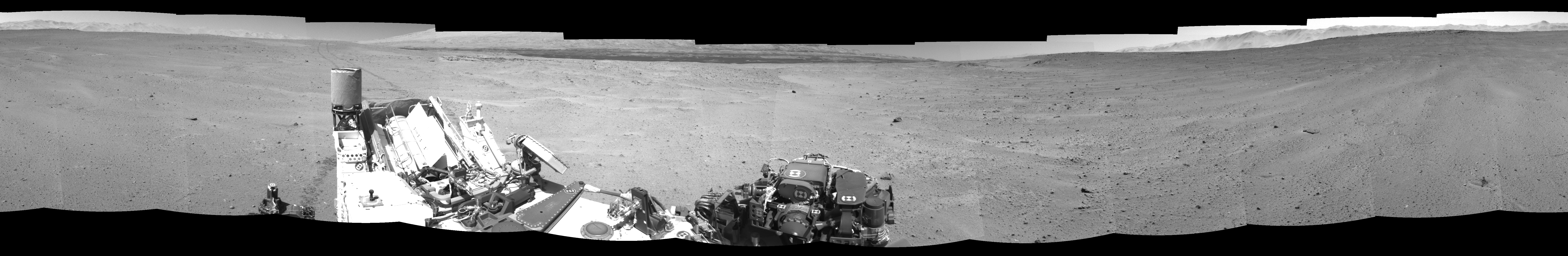 NASA's Mars rover Curiosity took 12 images in Gale Crater using its mast-mounted Left Navigation Camera (Navcam) to create this mosaic. The seam-corrected mosaic provides a 360-degree cylindrical-perspective projection panorama of the Martian surface suitable for stereo viewing, centered at 289 degrees azimuth (measured clockwise from north). This single-eye view must be combined with the partner right image to be viewed in stereo. Curiosity took the images on May 29, 2014, Sol 643 of the Mars Science Laboratory mission at drive 660, site number 33. The local mean solar time for the image exposures was 1 PM. Each Navcam image has a 45-degree field of view. CREDIT: NASA/JPL-Caltech