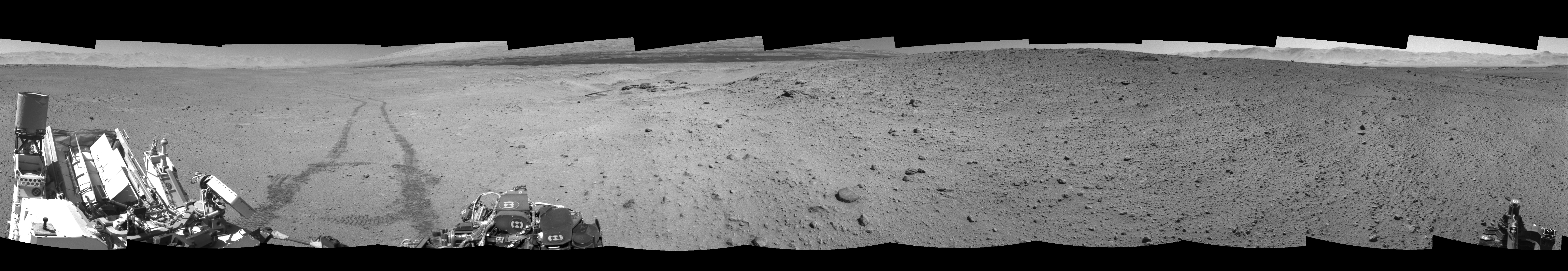 NASA's Mars rover Curiosity took 12 images in Gale Crater using its mast-mounted Left Navigation Camera (Navcam) to create this mosaic. The seam-corrected mosaic provides a 360-degree cylindrical-perspective projection panorama of the Martian surface suitable for stereo viewing, centered at 360 degrees azimuth (measured clockwise from north). This single-eye view must be combined with the partner right image to be viewed in stereo. Curiosity took the images on May 30, 2014, Sol 644 of the Mars Science Laboratory mission at drive 1036, site number 33. The local mean solar time for the image exposures was 1 PM. Each Navcam image has a 45-degree field of view. CREDIT: NASA/JPL-Caltech