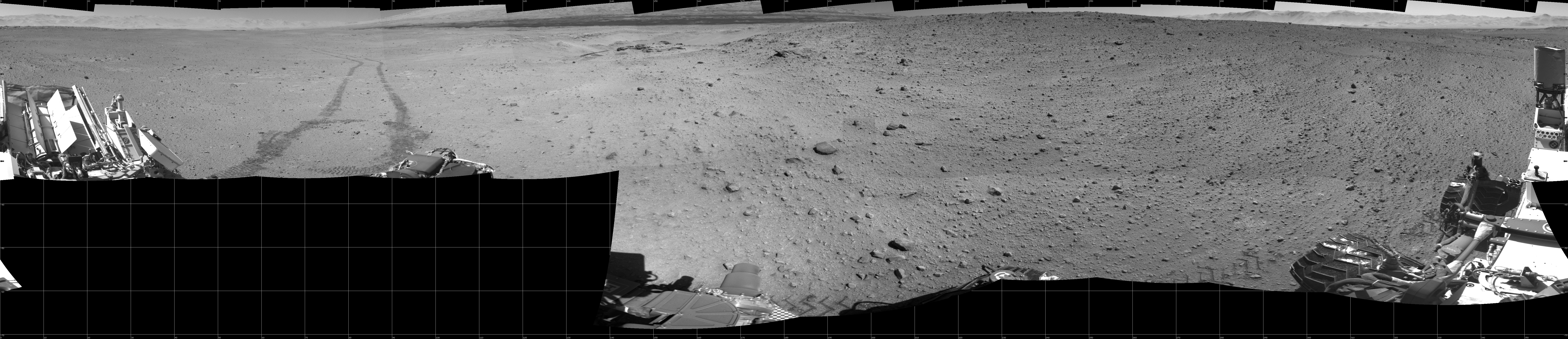 NASA's Mars rover Curiosity took 19 images in Gale Crater using its mast-mounted Right Navigation Camera (Navcam) to create this mosaic. The seam-corrected mosaic provides a 360-degree cylindrical projection panorama of the Martian surface centered at 180 degrees azimuth (measured clockwise from north). Curiosity took the images on May 30, 2014, Sol 644 of the Mars Science Laboratory mission at drive 1036, site number 33. The local mean solar time for the image exposures was 1 PM. Each Navcam image has a 45 degree field of view. CREDIT: NASA/JPL-Caltech