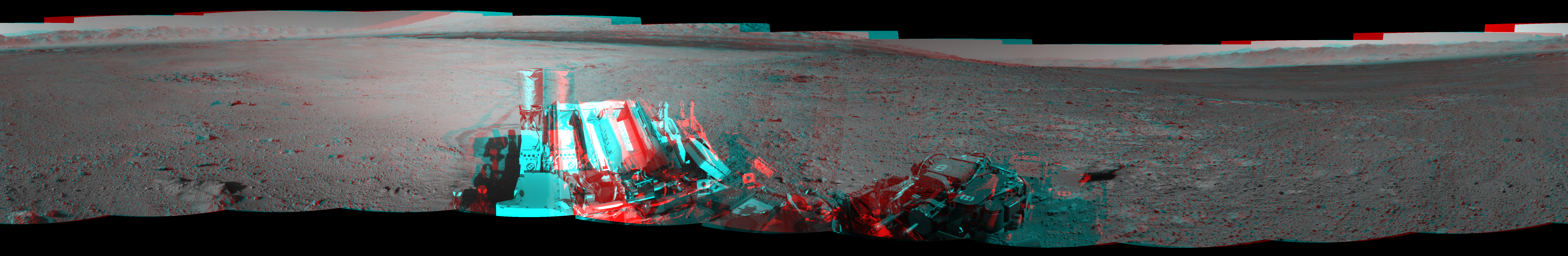 NASA's Mars rover Curiosity took 12 image pairs in Gale Crater using its mast-mounted Navigation Camera (Navcam) to create this mosaic. The seam-corrected mosaic provides a 360-degree cylindrical perspective projection panorama of the Martian surface suitable for stereo viewing, centered at 241 degrees azimuth (measured clockwise from north). This anaglyph must be viewed with red/blue glasses (red over left eye). Curiosity took the images on June 02, 2014, Sol 647 of the Mars Science Laboratory mission at drive 0, site number 34. The local mean solar time for the image exposures was from 2 PM to 4 PM. Each Navcam image has a 45-degree field of view. CREDIT: NASA/JPL-Caltech