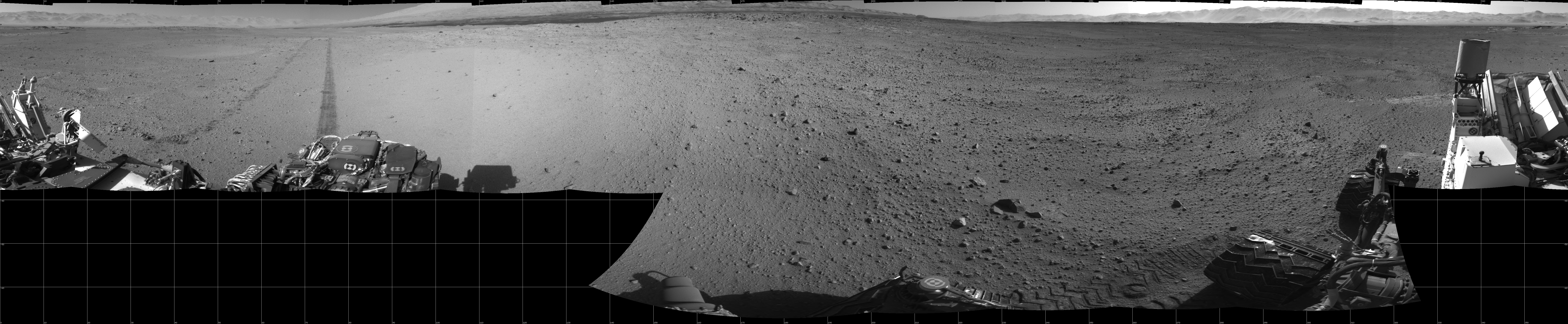 NASA's Mars rover Curiosity took 17 images in Gale Crater using its mast-mounted Left Navigation Camera (Navcam) to create this mosaic. The seam-corrected mosaic provides a 360-degree cylindrical projection panorama of the Martian surface centered at 180 degrees azimuth (measured clockwise from north). Curiosity took the images on June 04, 2014, Sol 649 of the Mars Science Laboratory mission at drive 286, site number 34. The local mean solar time for the image exposures was 3 PM. Each Navcam image has a 45 degree field of view. CREDIT: NASA/JPL-Caltech