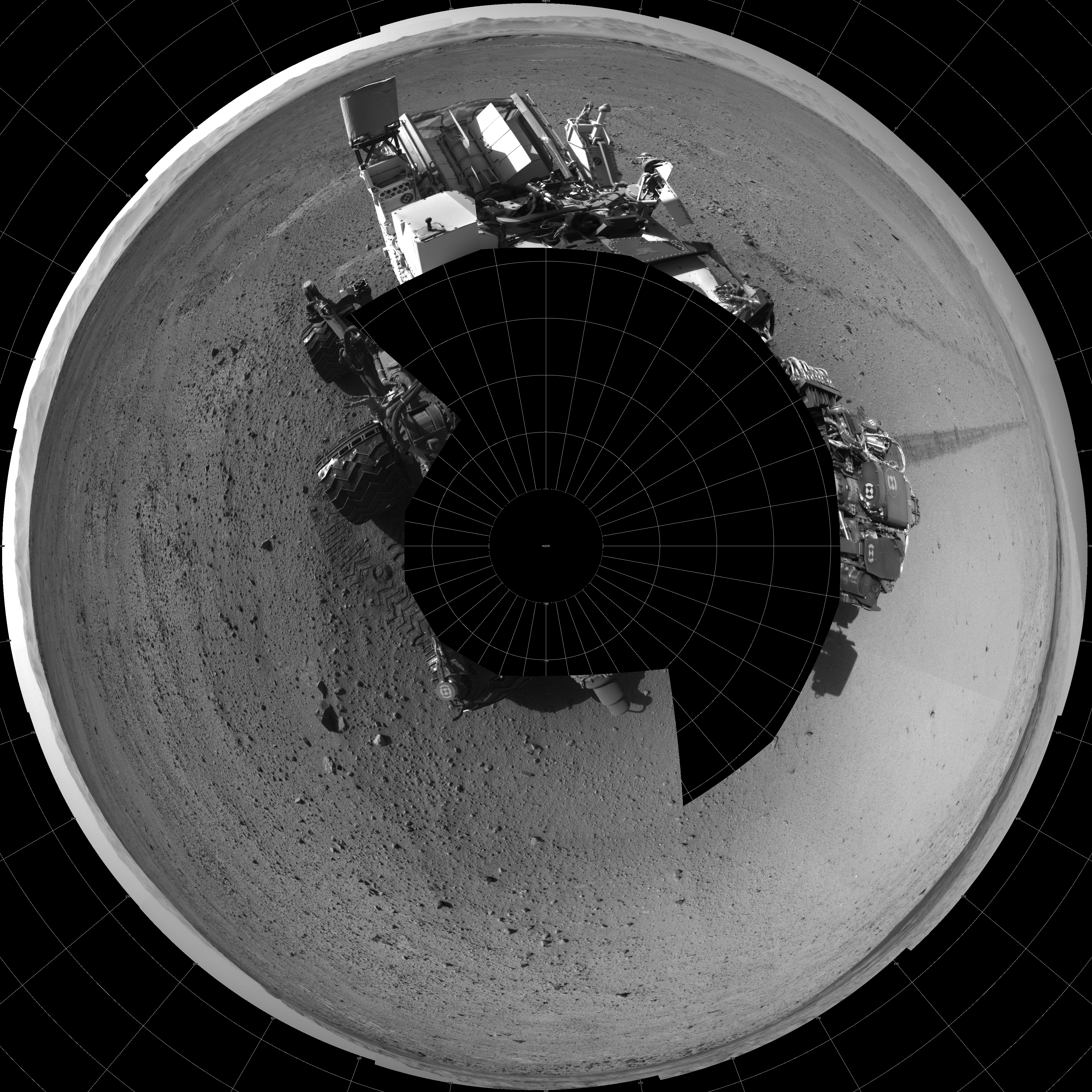 NASA's Mars rover Curiosity took 17 images in Gale Crater using its mast-mounted Left Navigation Camera (Navcam) to create this mosaic. The seam-corrected mosaic provides a polar stereographic projection panorama of the Martian surface with 0 degrees azimuth (measured clockwise from north) at the top of the image. Curiosity took the images on June 04, 2014, Sol 649 of the Mars Science Laboratory mission at drive 286, site number 34. The local mean solar time for the image exposures was 3 PM. Each Navcam image has a 45-degree field of view. CREDIT: NASA/JPL-Caltech