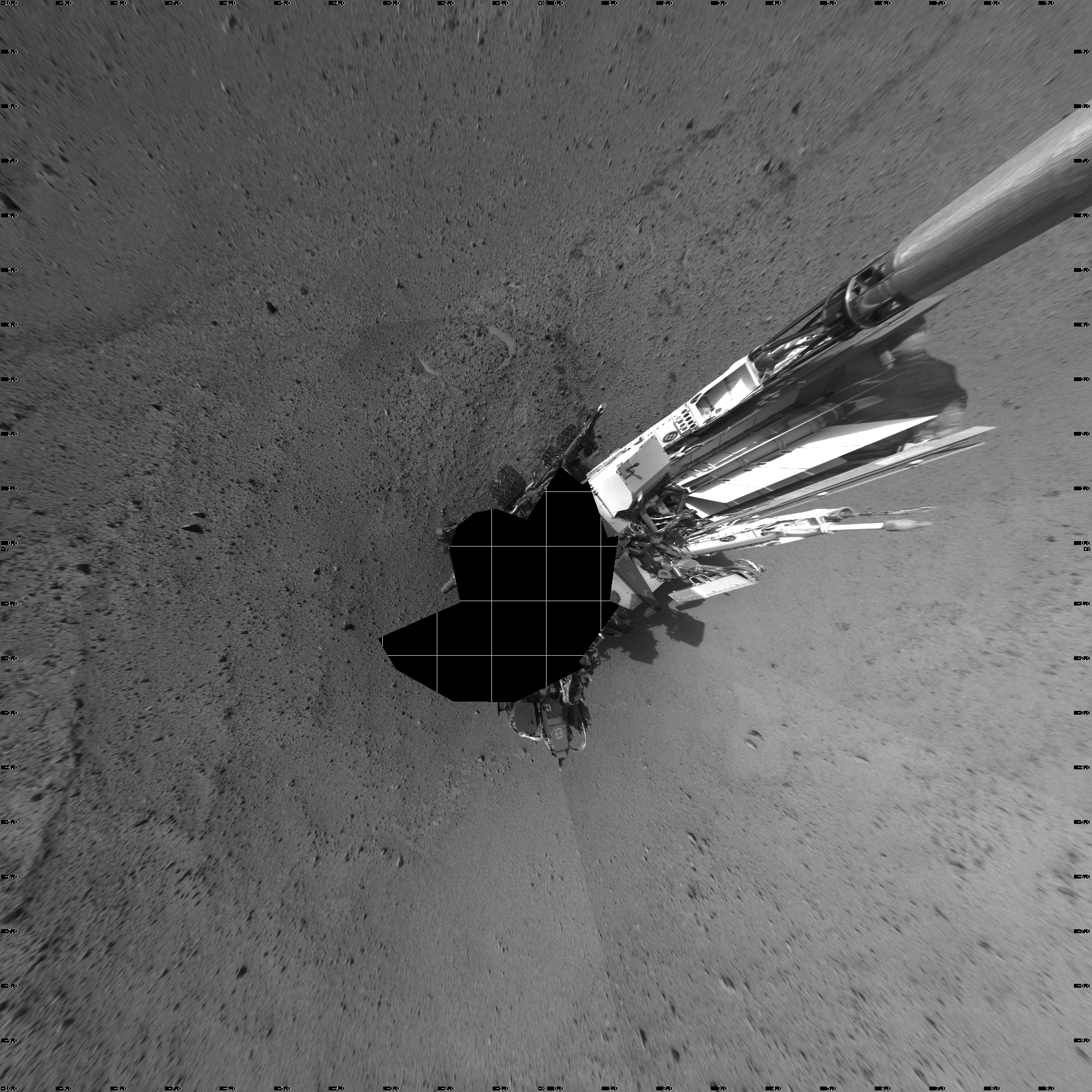 NASA's Mars rover Curiosity took 17 images in Gale Crater using its mast-mounted Left Navigation Camera (Navcam) to create this mosaic. The seam-corrected mosaic provides a vertical projection of the Martian surface near the rover, covering an area of 20 meters (north/south) by 20 meters (east/west). North is up in the image. This projection provides an overhead view, but introduces distortion for items not on the surface, such as large rocks and the rover itself. Curiosity took the images on June 11, 2014, Sol 656 of the Mars Science Laboratory mission at drive 1120, site number 34. The local mean solar time for the image exposures was from 3 PM to 4 PM. Each Navcam image has a 45-degree field of view. CREDIT: NASA/JPL-Caltech