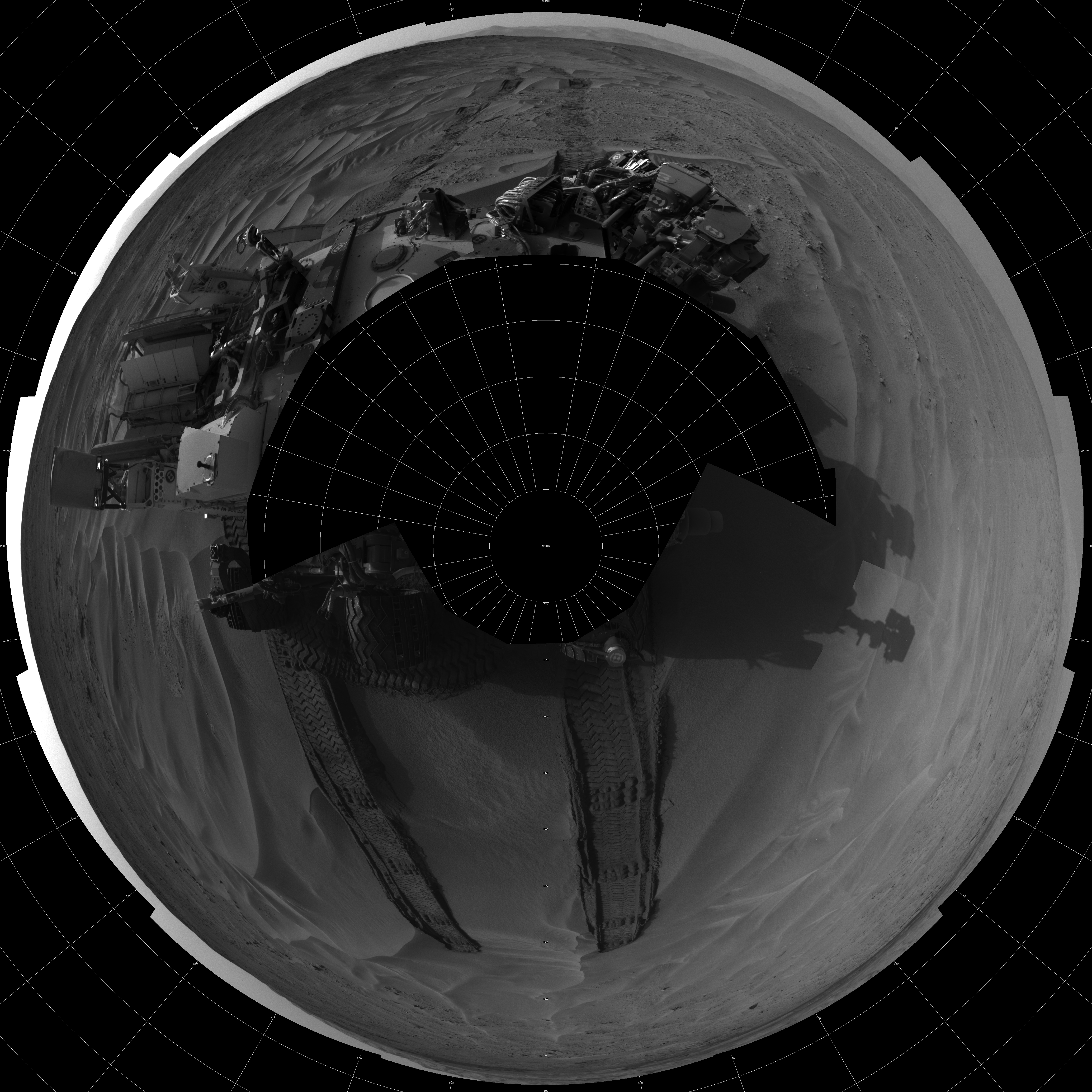 NASA's Mars rover Curiosity took 17 images in Gale Crater using its mast-mounted Left Navigation Camera (Navcam) to create this mosaic. The seam-corrected mosaic provides a polar stereographic projection panorama of the Martian surface with 0 degrees azimuth (measured clockwise from north) at the top of the image. Curiosity took the images on June 30, 2014, Sol 674 of the Mars Science Laboratory mission at drive 58, site number 38. The local mean solar time for the image exposures was 4 PM. Each Navcam image has a 45-degree field of view. CREDIT: NASA/JPL-Caltech