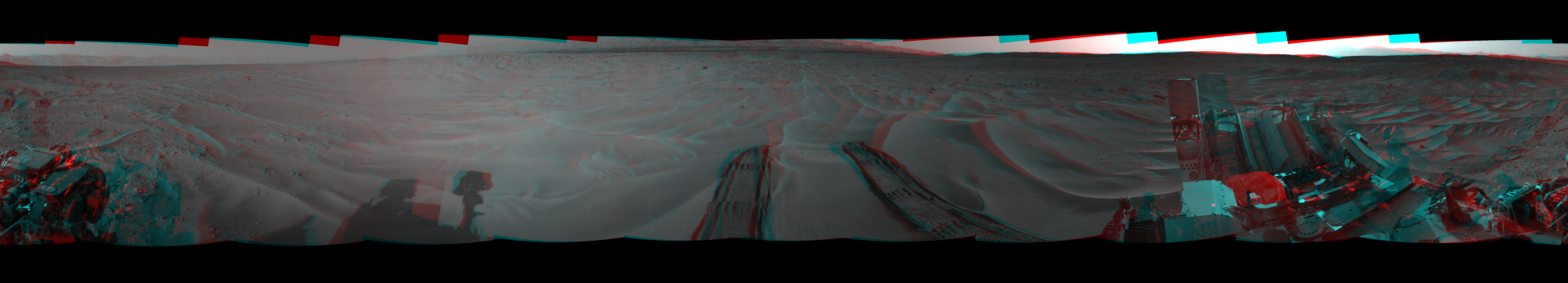 NASA's Mars rover Curiosity took 12 image pairs in Gale Crater using its mast-mounted Navigation Camera (Navcam) to create this mosaic. The seam-corrected mosaic provides a 360-degree cylindrical perspective projection panorama of the Martian surface suitable for stereo viewing, centered at 91 degrees azimuth (measured clockwise from north). This anaglyph must be viewed with red/blue glasses (red over left eye). Curiosity took the images on June 30, 2014, Sol 674 of the Mars Science Laboratory mission at drive 58, site number 38. The local mean solar time for the image exposures was 4 PM. Each Navcam image has a 45-degree field of view. CREDIT: NASA/JPL-Caltech