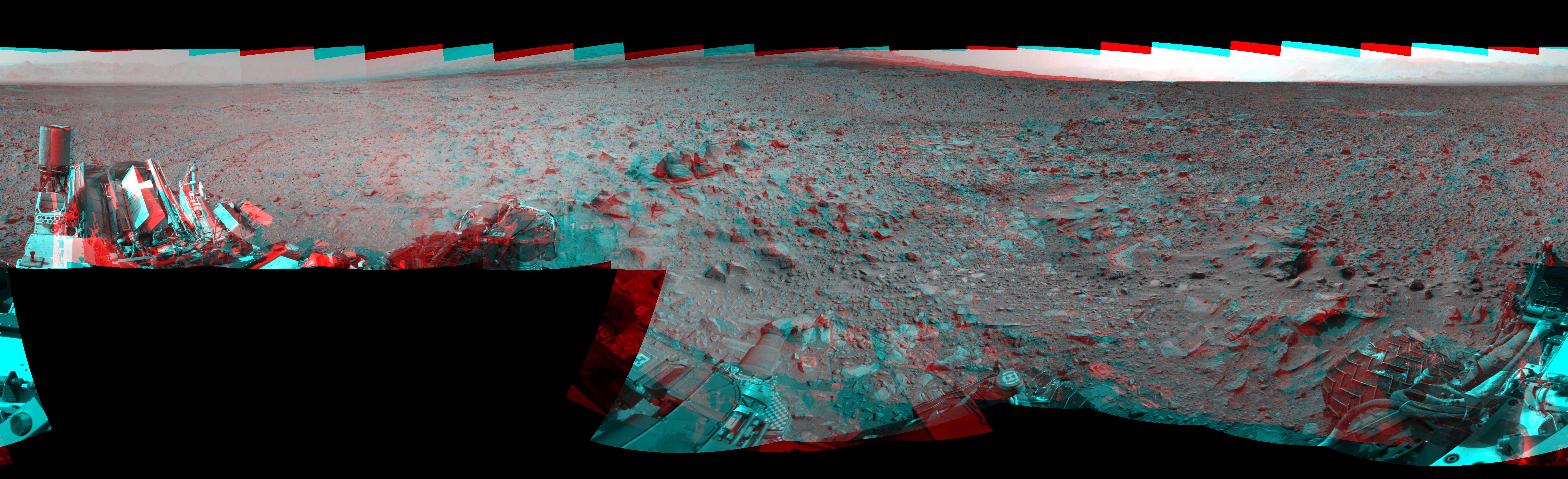 NASA's Mars rover Curiosity took 19 image pairs in Gale Crater using its mast-mounted Navigation Camera (Navcam) to create this mosaic. The seam-corrected mosaic provides a 360-degree cylindrical perspective projection panorama of the Martian surface suitable for stereo viewing, centered at 354 degrees azimuth (measured clockwise from north). This anaglyph must be viewed with red/blue glasses (red over left eye). Curiosity took the images on July 18, 2014, Sol 692 of the Mars Science Laboratory mission at drive 1176, site number 39. The local mean solar time for the image exposures was 2 PM. Each Navcam image has a 45-degree field of view. CREDIT: NASA/JPL-Caltech