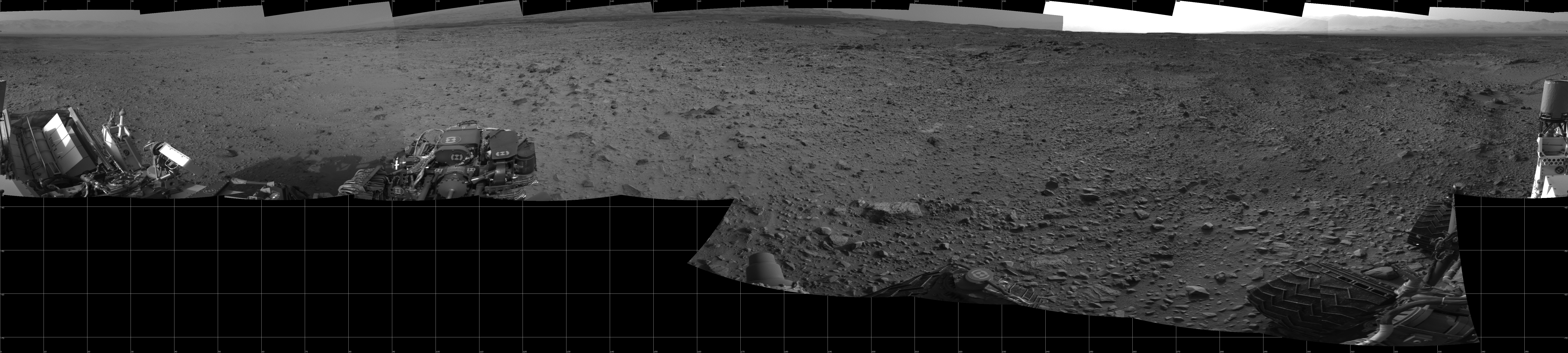 NASA's Mars rover Curiosity took 17 images in Gale Crater using its mast-mounted Left Navigation Camera (Navcam) to create this mosaic. The seam-corrected mosaic provides a 360-degree cylindrical projection panorama of the Martian surface centered at 180 degrees azimuth (measured clockwise from north). Curiosity took the images on July 22, 2014, Sol 696 of the Mars Science Laboratory mission at drive 1552, site number 39. The local mean solar time for the image exposures was from 1 PM to 4 PM. Each Navcam image has a 45 degree field of view. CREDIT: NASA/JPL-Caltech
