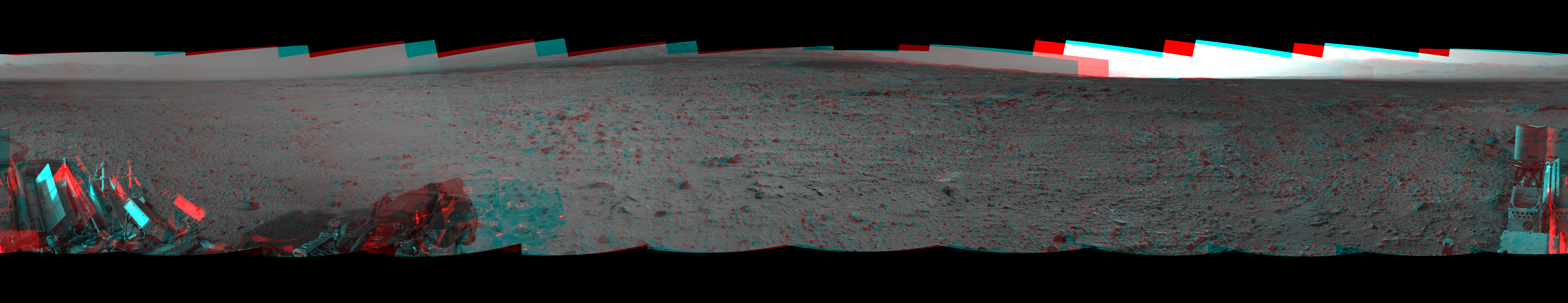 NASA's Mars rover Curiosity took 12 image pairs in Gale Crater using its mast-mounted Navigation Camera (Navcam) to create this mosaic. The seam-corrected mosaic provides a 360-degree cylindrical perspective projection panorama of the Martian surface suitable for stereo viewing, centered at 10 degrees azimuth (measured clockwise from north). This anaglyph must be viewed with red/blue glasses (red over left eye). Curiosity took the images on July 22, 2014, Sol 696 of the Mars Science Laboratory mission at drive 1552, site number 39. The local mean solar time for the image exposures was 1 PM. Each Navcam image has a 45-degree field of view. CREDIT: NASA/JPL-Caltech