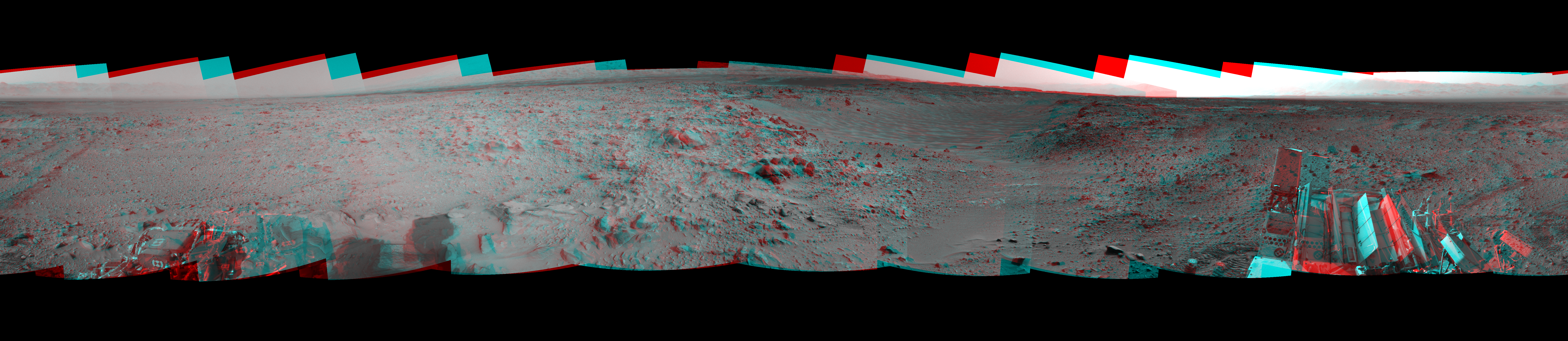 NASA's Mars rover Curiosity took 19 image pairs in Gale Crater using its mast-mounted Navigation Camera (Navcam) to create this mosaic. The seam-corrected mosaic provides a 360-degree cylindrical perspective projection panorama of the Martian surface suitable for stereo viewing, centered at 66 degrees azimuth (measured clockwise from north). This anaglyph must be viewed with red/blue glasses (red over left eye). Curiosity took the images on August 01, 2014, Sol 705 of the Mars Science Laboratory mission at drive 0, site number 40. The local mean solar time for the image exposures was from 2 PM to 3 PM. Each Navcam image has a 45-degree field of view. CREDIT: NASA/JPL-Caltech