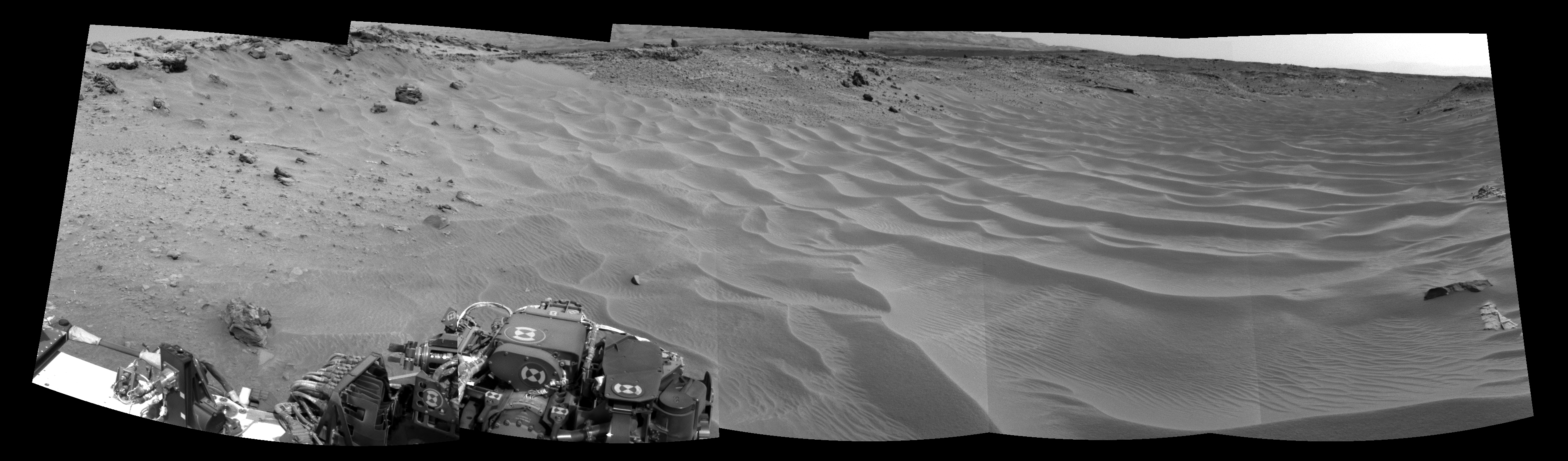 NASA's Mars rover Curiosity took 5 images in Gale Crater using its mast-mounted Left Navigation Camera (Navcam) to create this mosaic. The seam-corrected mosaic provides a 177-degree cylindrical-perspective projection panorama of the Martian surface suitable for stereo viewing, centered at 320 degrees azimuth (measured clockwise from north). This single-eye view must be combined with the partner right image to be viewed in stereo.  Curiosity took the images on August 02, 2014, Sol 706 of the Mars Science Laboratory mission at drive 200, site number 40. The local mean solar time for the image exposures was 2 PM. Each Navcam image has a 45-degree field of view. CREDIT: NASA/JPL-Caltech