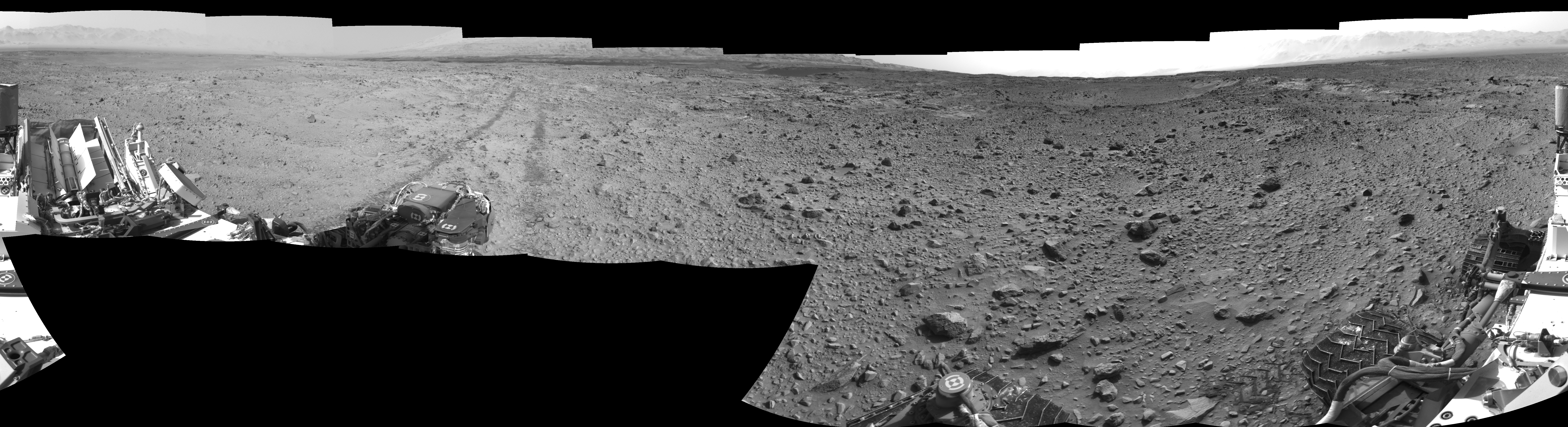 NASA's Mars rover Curiosity took 17 images in Gale Crater using its mast-mounted Right Navigation Camera (Navcam) to create this mosaic. The seam-corrected mosaic provides a 0-degree cylindrical-perspective projection panorama of the Martian surface suitable for stereo viewing, centered at 175 degrees azimuth (measured clockwise from north). This single-eye view must be combined with the partner left image to be viewed in stereo. Curiosity took the images on August 25, 2014, Sol 729 of the Mars Science Laboratory mission at drive 1850, site number 40. The local mean solar time for the image exposures was 2 PM. Each Navcam image has a 45-degree field of view. CREDIT: NASA/JPL-Caltech
