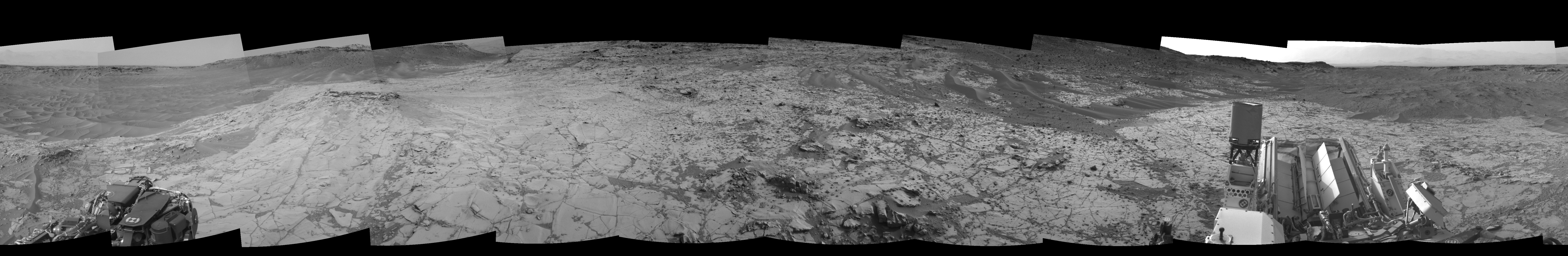 NASA's Mars rover Curiosity took 12 images in Gale Crater using its mast-mounted Right Navigation Camera (Navcam) to create this mosaic. The seam-corrected mosaic provides a 0-degree cylindrical-perspective projection panorama of the Martian surface suitable for stereo viewing, centered at 248 degrees azimuth (measured clockwise from north). This single-eye view must be combined with the partner left image to be viewed in stereo. Curiosity took the images on October 17, 2014, Sol 780 of the Mars Science Laboratory mission at drive 216, site number 43. The local mean solar time for the image exposures was from 2 PM to 3 PM. Each Navcam image has a 45-degree field of view. CREDIT: NASA/JPL-Caltech