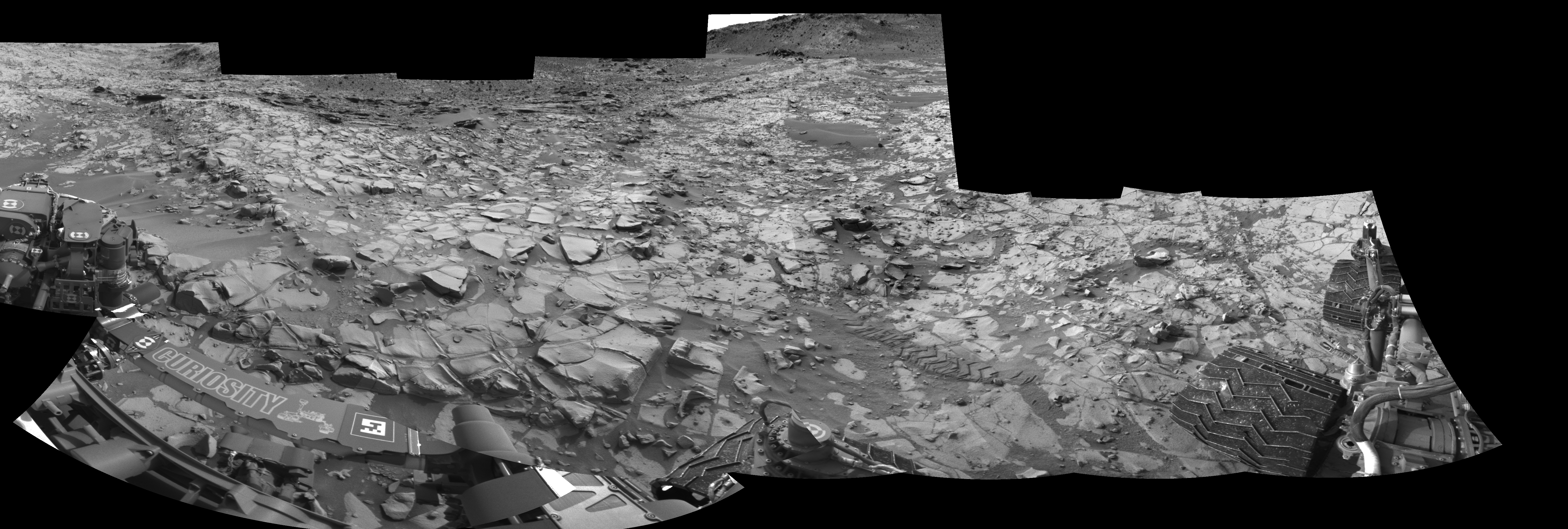 NASA's Mars rover Curiosity took 12 images in Gale Crater using its mast-mounted Left Navigation Camera (Navcam) to create this mosaic. The seam-corrected mosaic provides a 275-degree cylindrical-perspective projection panorama of the Martian surface suitable for stereo viewing, centered at 68 degrees azimuth (measured clockwise from north). This single-eye view must be combined with the partner right image to be viewed in stereo. Curiosity took the images on November 24, 2014, Sol 817 of the Mars Science Laboratory mission at drive 1828, site number 44. The local mean solar time for the image exposures was 1 PM. Each Navcam image has a 45-degree field of view. CREDIT: NASA/JPL-Caltech