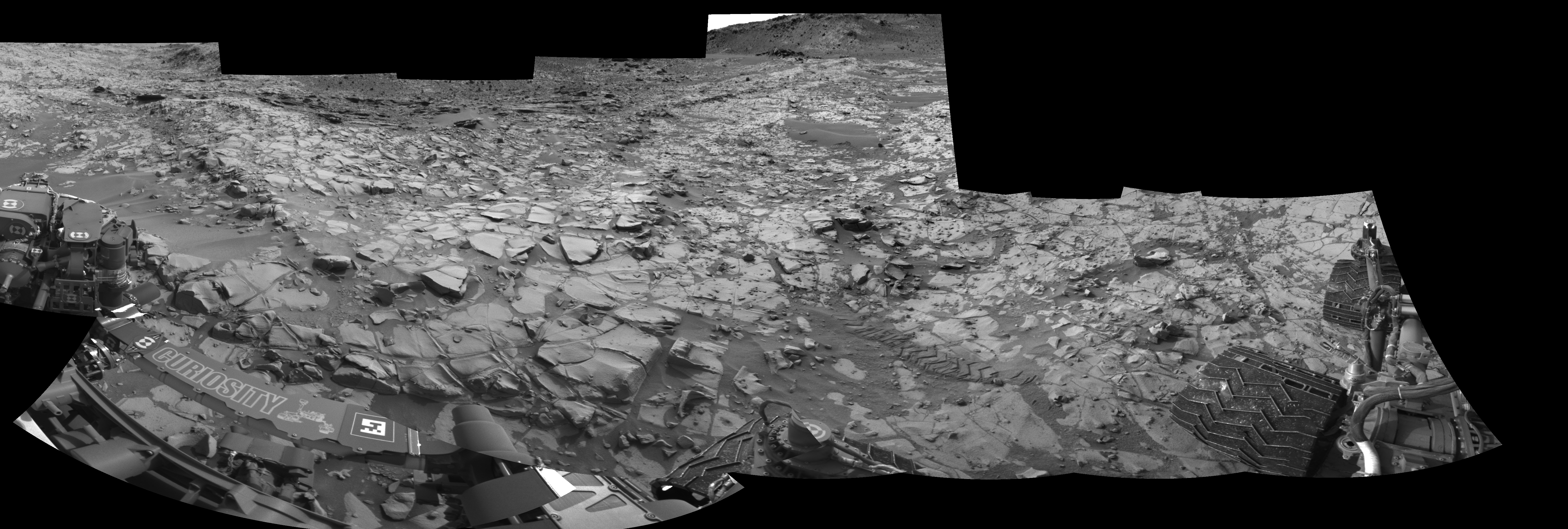 NASA's Mars rover Curiosity took 12 images in Gale Crater using its mast-mounted Left Navigation Camera (Navcam) to create this mosaic. The seam-corrected mosaic provides a 275-degree cylindrical-perspective projection panorama of the Martian surface suitable for stereo viewing, centered at 68 degrees azimuth (measured clockwise from north). This single-eye view must be combined with the partner right image to be viewed in stereo. Curiosity took the images on November 24, 2014, Sol 817 of the Mars Science Laboratory mission at drive 1828, site number 44. The local mean solar time for the image exposures was 1 PM. Each Navcam image has a 45-degree field of view. CREDIT: NASA/JPL-Caltech