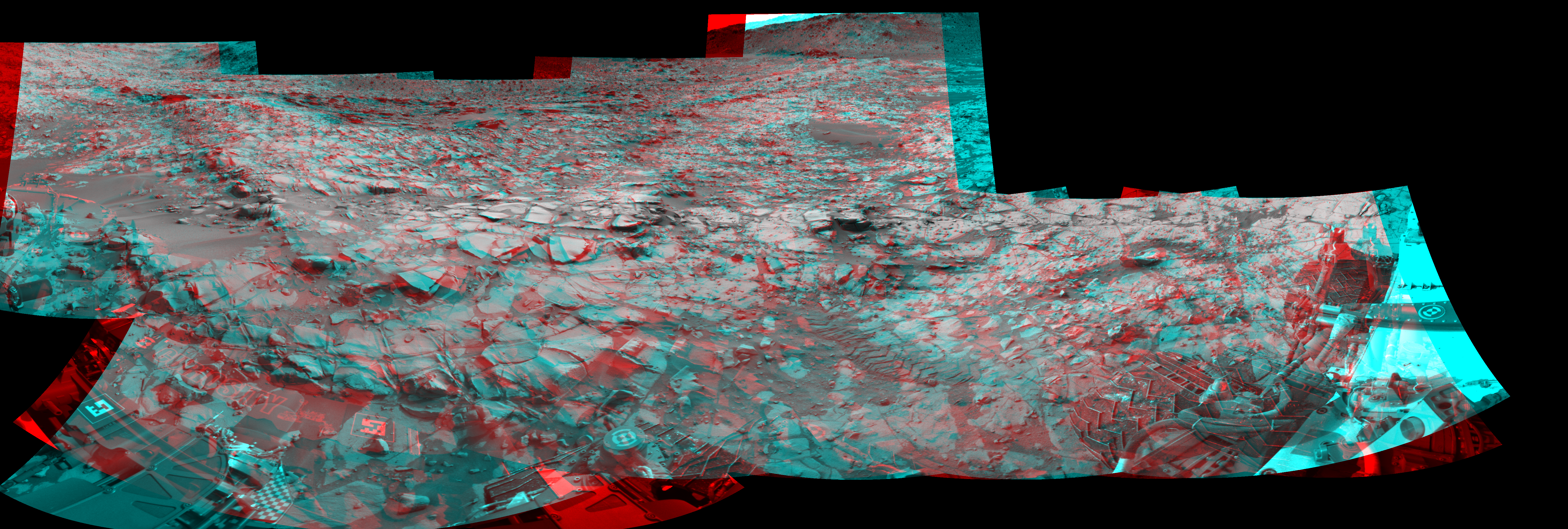 NASA's Mars rover Curiosity took 12 image pairs in Gale Crater using its mast-mounted Navigation Camera (Navcam) to create this mosaic. The seam-corrected mosaic provides a 275-degree cylindrical perspective projection panorama of the Martian surface suitable for stereo viewing, centered at 68 degrees azimuth (measured clockwise from north). This anaglyph must be viewed with red/blue glasses (red over left eye). Curiosity took the images on November 24, 2014, Sol 817 of the Mars Science Laboratory mission at drive 1828, site number 44. The local mean solar time for the image exposures was 1 PM. Each Navcam image has a 45-degree field of view. CREDIT: NASA/JPL-Caltech