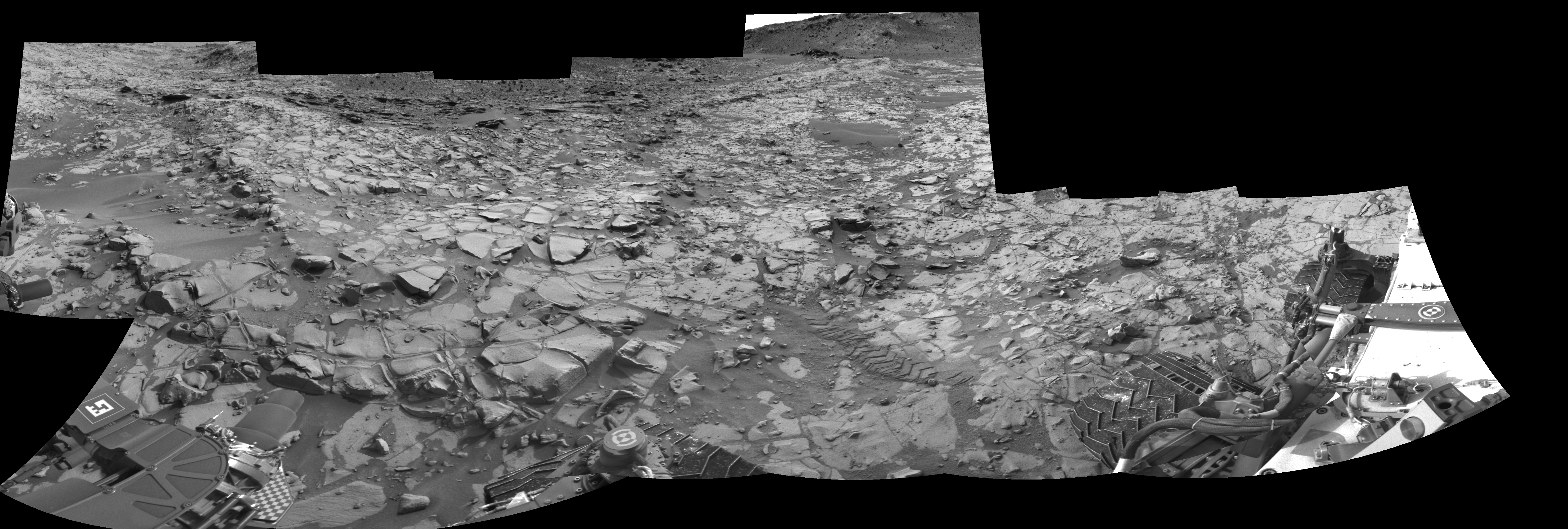 NASA's Mars rover Curiosity took 12 images in Gale Crater using its mast-mounted Right Navigation Camera (Navcam) to create this mosaic. The seam-corrected mosaic provides a 275-degree cylindrical-perspective projection panorama of the Martian surface suitable for stereo viewing, centered at 61 degrees azimuth (measured clockwise from north). This single-eye view must be combined with the partner left image to be viewed in stereo. Curiosity took the images on November 24, 2014, Sol 817 of the Mars Science Laboratory mission at drive 1828, site number 44. The local mean solar time for the image exposures was 1 PM. Each Navcam image has a 45-degree field of view. CREDIT: NASA/JPL-Caltech