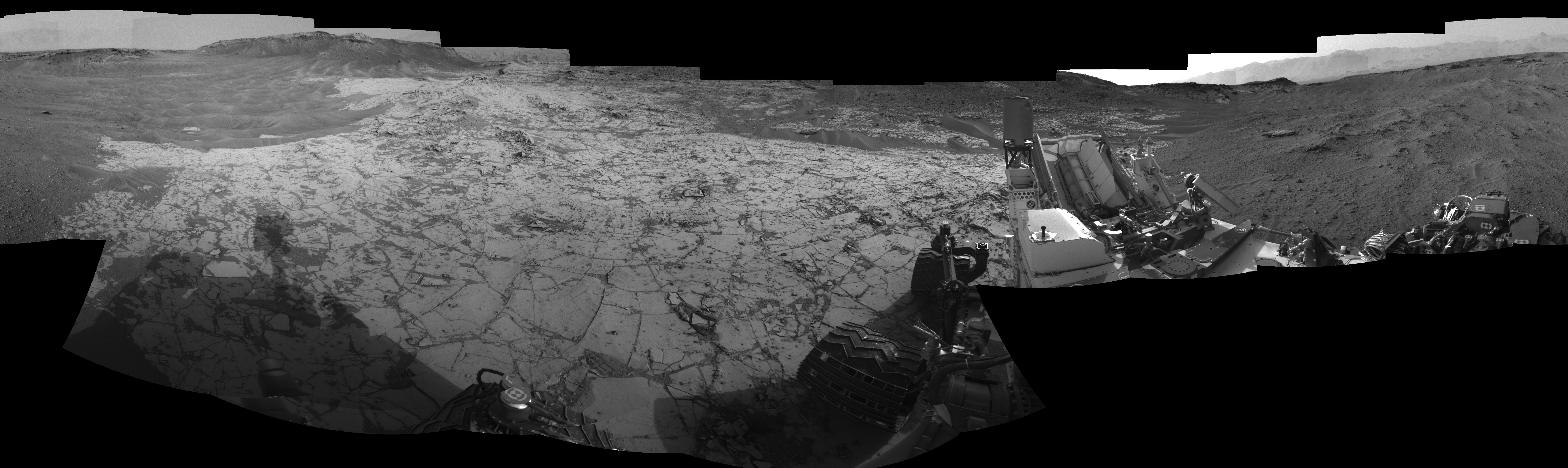 NASA's Mars rover Curiosity took 22 images in Gale Crater using its mast-mounted Left Navigation Camera (Navcam) to create this mosaic. The seam-corrected mosaic provides a 360-degree cylindrical-perspective projection panorama of the Martian surface suitable for stereo viewing, centered at 135 degrees azimuth (measured clockwise from north). This single-eye view must be combined with the partner right image to be viewed in stereo.  Curiosity took the images on January 09, 2015, Sol 862 of the Mars Science Laboratory mission at drive 2958, site number 44. The local mean solar time for the image exposures was 4 PM. Each Navcam image has a 45-degree field of view. CREDIT: NASA/JPL-Caltech