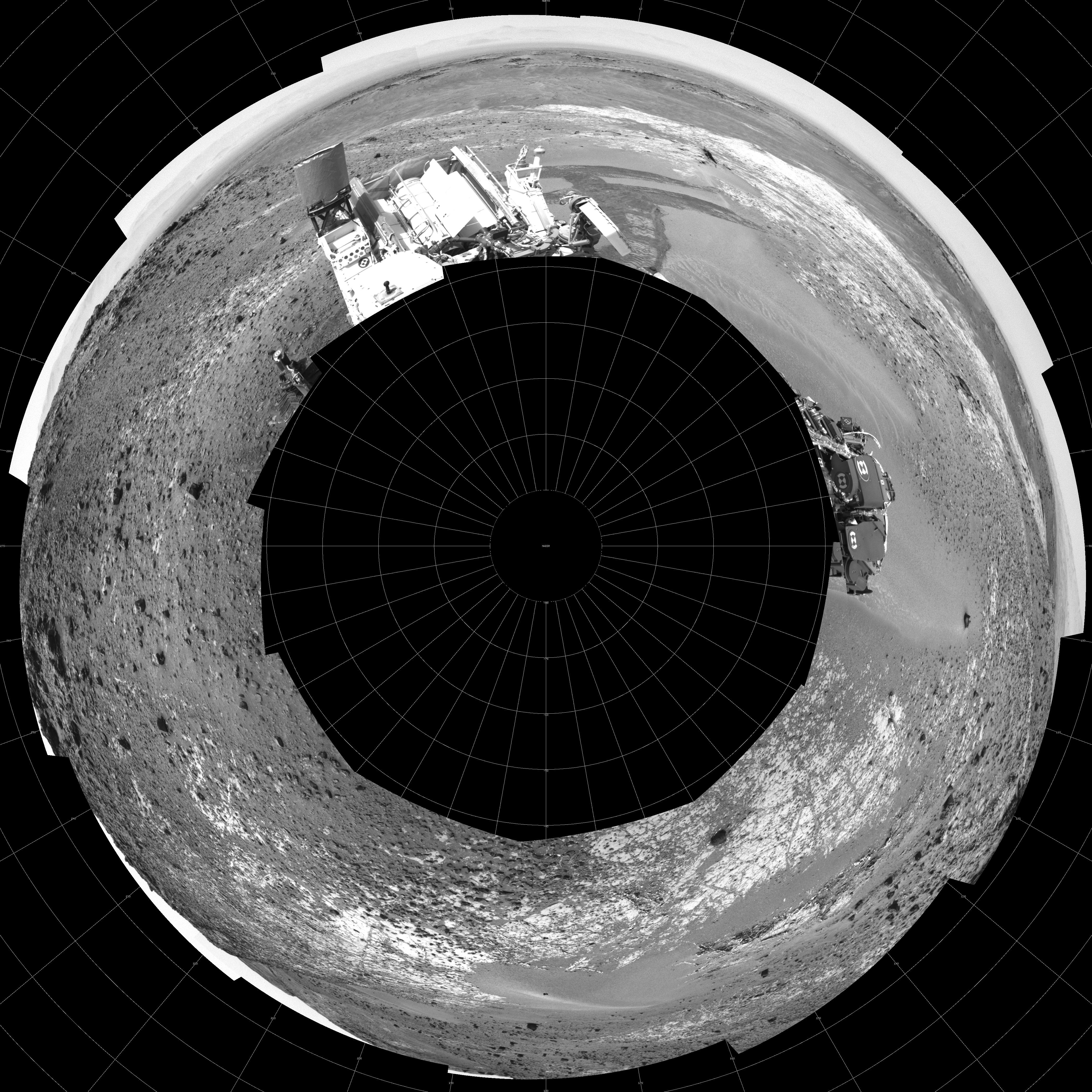 NASA's Mars rover Curiosity took 12 images in Gale Crater using its mast-mounted Left Navigation Camera (Navcam) to create this mosaic. The seam-corrected mosaic provides a polar stereographic projection panorama of the Martian surface with 0 degrees azimuth (measured clockwise from north) at the top of the image. Curiosity took the images on March 14, 2015, Sol 924 of the Mars Science Laboratory mission at drive 774, site number 45. The local mean solar time for the image exposures was 2 PM. Each Navcam image has a 45-degree field of view. CREDIT: NASA/JPL-Caltech
