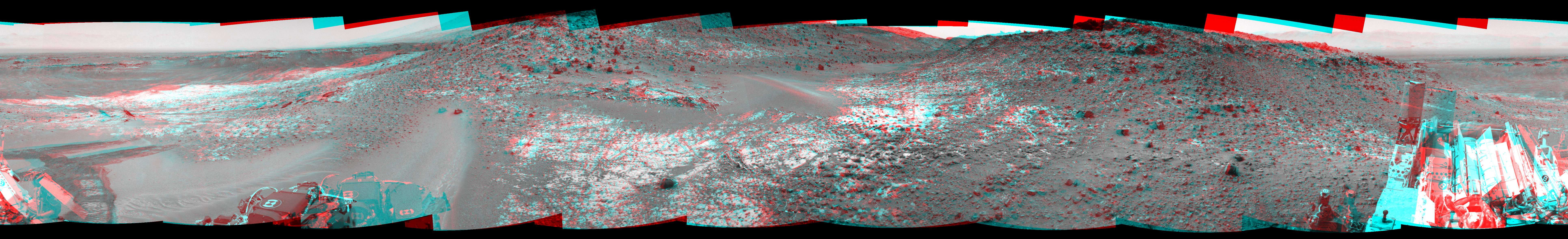 NASA's Mars rover Curiosity took 12 image pairs in Gale Crater using its mast-mounted Navigation Camera (Navcam) to create this mosaic. The seam-corrected mosaic provides a 360-degree cylindrical perspective projection panorama of the Martian surface suitable for stereo viewing, centered at 37 degrees azimuth (measured clockwise from north). This anaglyph must be viewed with red/blue glasses (red over left eye). Curiosity took the images on March 14, 2015, Sol 924 of the Mars Science Laboratory mission at drive 774, site number 45. The local mean solar time for the image exposures was 2 PM. Each Navcam image has a 45-degree field of view. CREDIT: NASA/JPL-Caltech